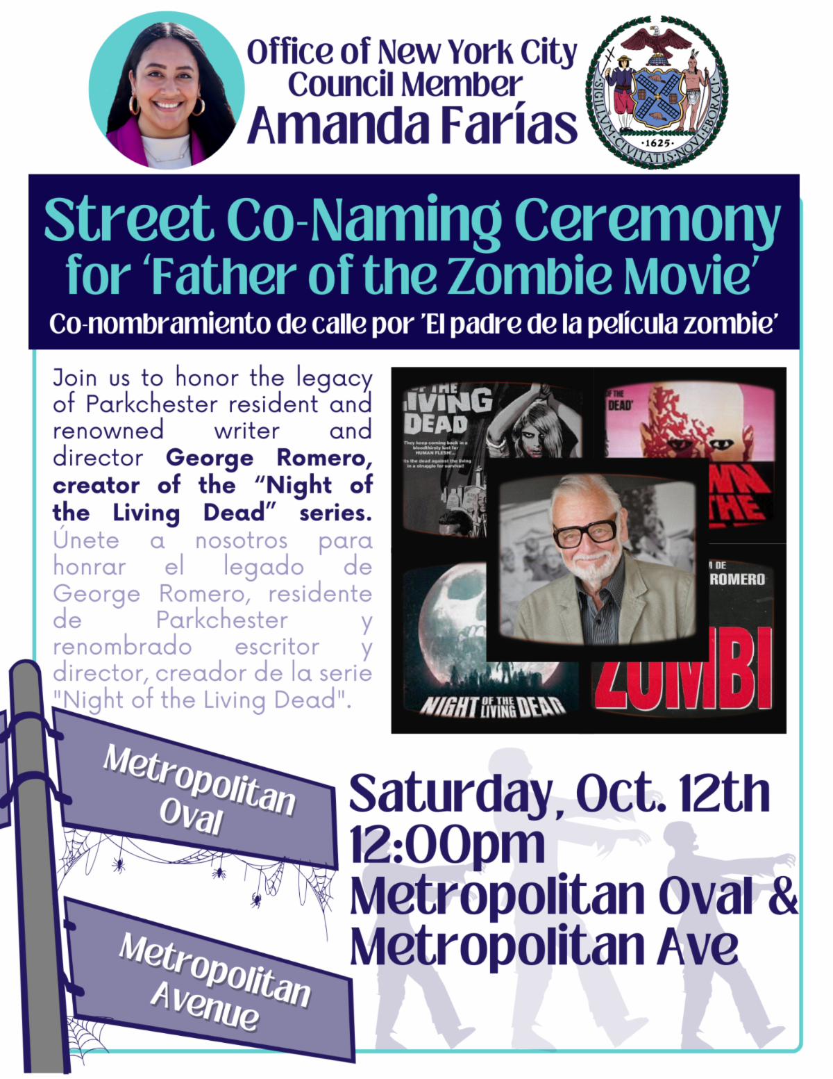 To celebrate, my office is hosting a street co-naming ceremony in Parkchester for the 'Father of Zombie Movies' and Bronx native George Romero on Saturday, October 12th at 12 PM, a nighttime showing of Hocus Pocus on Friday, October 11th at 6:30 PM, and our huge annual Fall Festival on Saturday, October 19th from 12 PM - 4 PM.