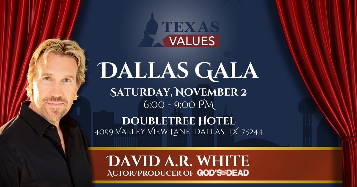 David A.R. White, one of the most prolific actors/filmmakers in the Christian, faith-based arena, also a writer, director, and producer in many of the films found on Pure Flix Entertainment; including the God’s Not Dead Franchise, will be Texas Values Keynote Speaker at the upcoming Dallas Gala on November 2nd!