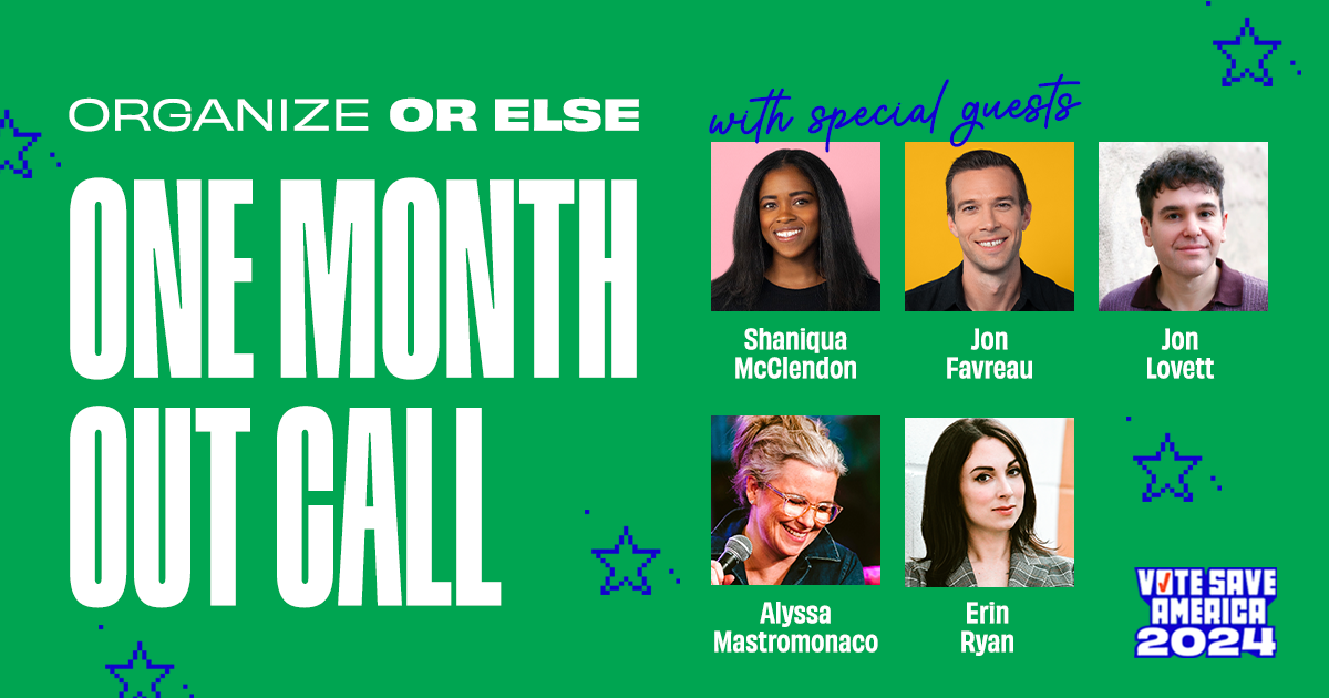 Instead of hyperventilating into the nearest paper bag, we’re getting hyped for the final push. That’s why tomorrow, October 8 at 8p ET/5p PT, Vote Save America is hosting our One Month Out Call. It’s the party of the season, and you’re invited!