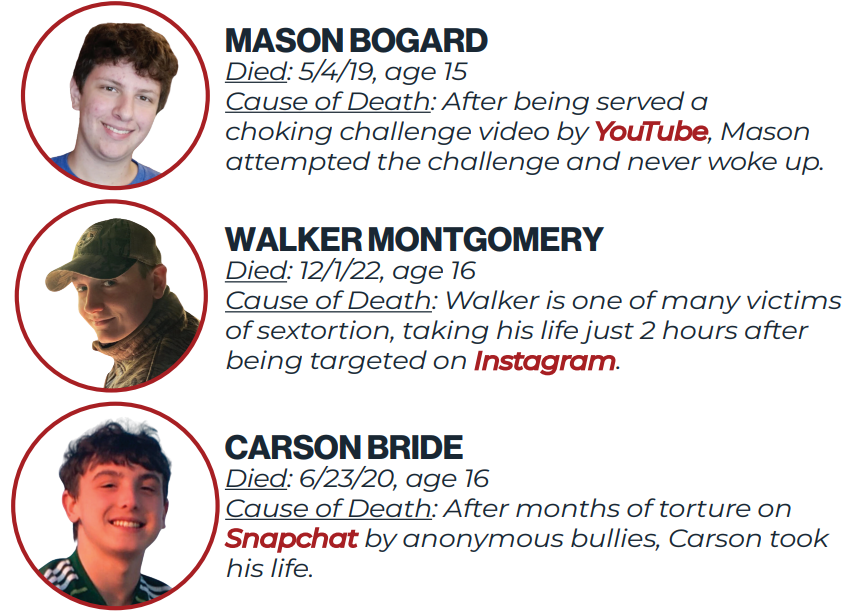 Scrolling 2 Death & Project Stand have created a flyer, "The Faces of Social Media Harm." It commemorates deceased children and urgently calls for the passing of KOSA, explaining how this bill will save lives. We thank Scrolling 2 Death and Project STAND for this valuable resource, and urge YOU to use it to spread the word!