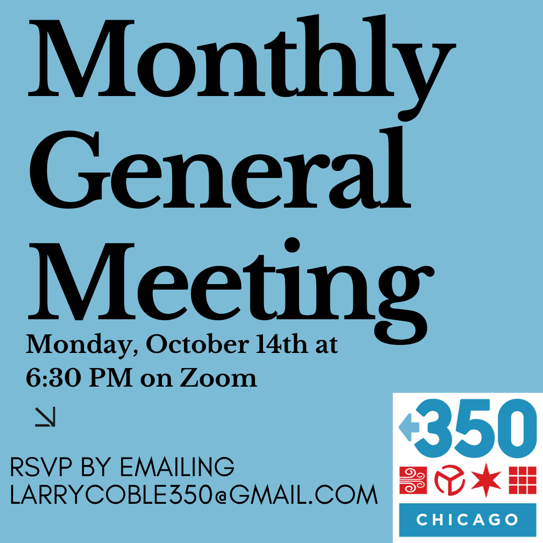 Our next 350 Chicago General Meeting is Monday, October,14th from 6:30-7:30 PM. To join the meeting, please RSVP to [email protected] and he will send you the meeting link.