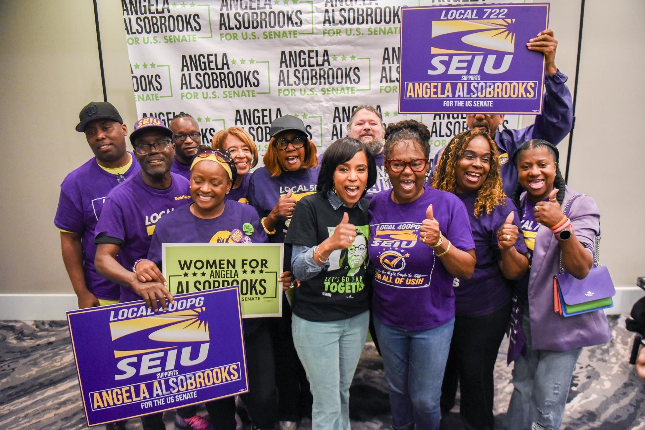 Top left: SEIU Local 722 rallied with Angela Alsobrooks on Saturday. Top right: Alsobrooks joined 32BJ SEIU to close out Hispanic Heritage Month later that day. Bottom left: 1199 SEIU and Washington Teachers' Union teamed up to knock doors in Prince George's County. Bottom right: IUPAT DC 51, IBEW Local 26, Steamfitters Local 602, Plumbers & Gasfitters Local 5, and ATU Local 689 worked together for a labor walk near Lanham, MD on Saturday.