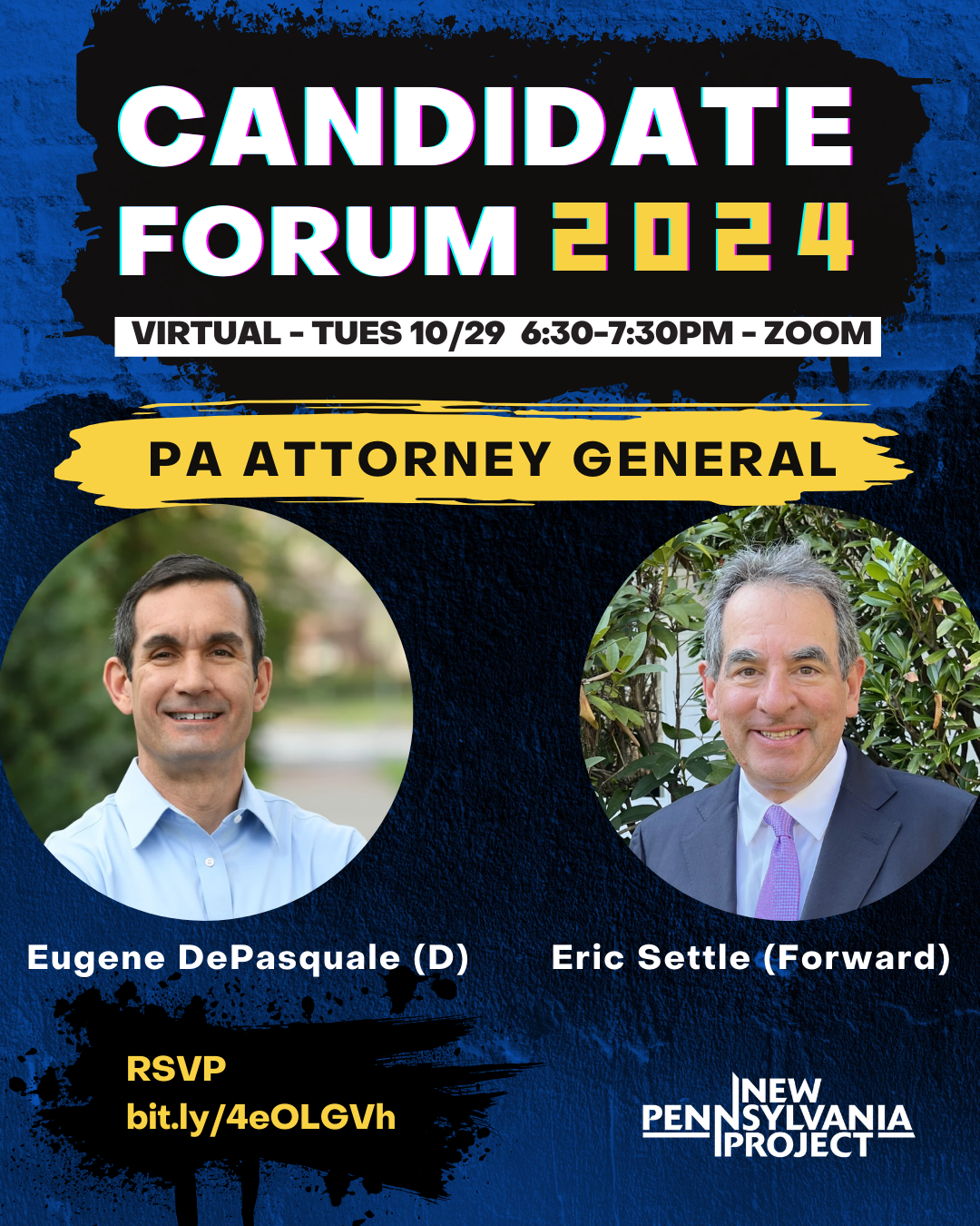 Please join the New Pennsylvania Project for a virtual candidate forum with Eugene DePasquale (Democrat) and Eric Settle (Forward Party).