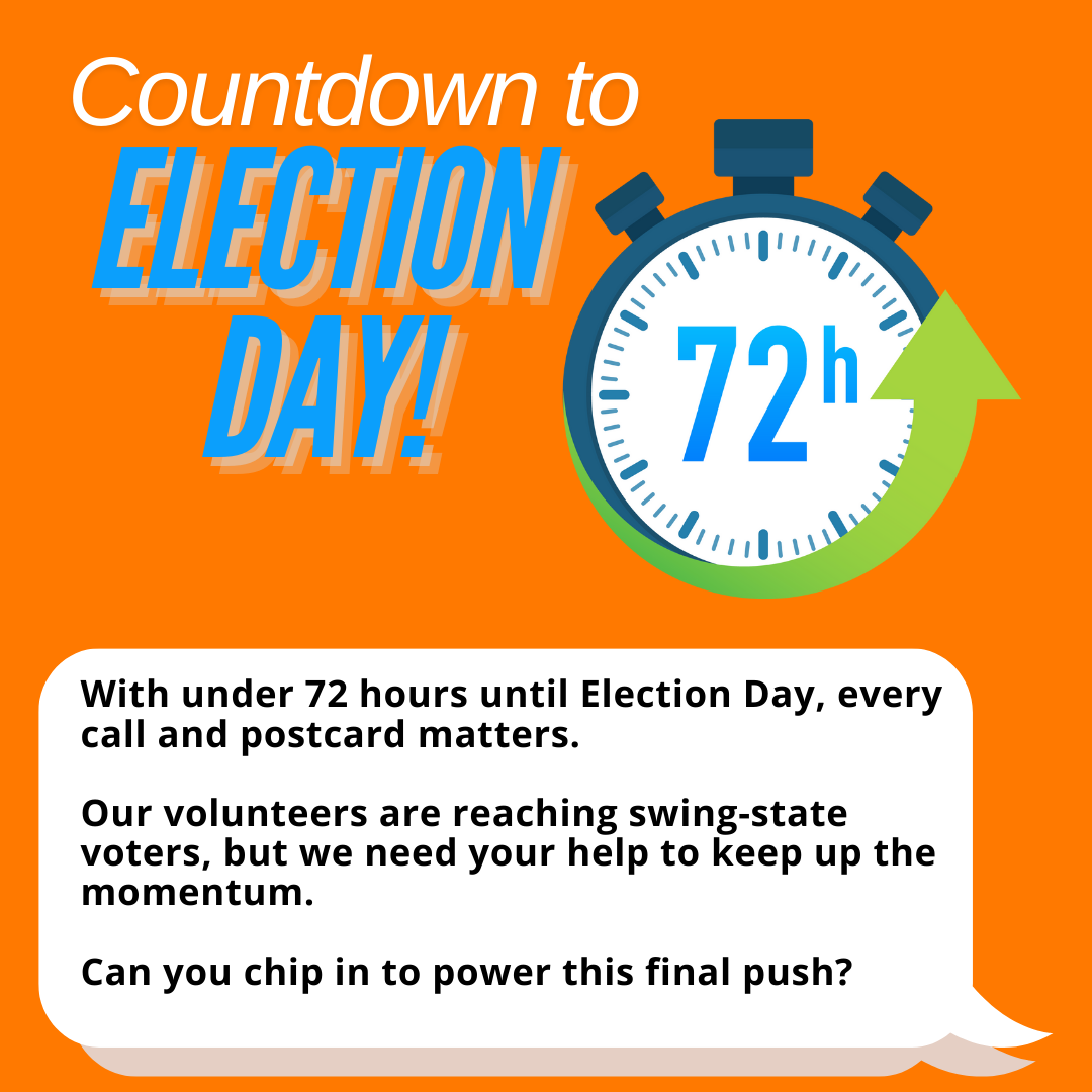 With under 72 hours until Election Day, every call and postcard matters. Our volunteers are reaching swing-state voters, but we need your help to keep up the momentum.