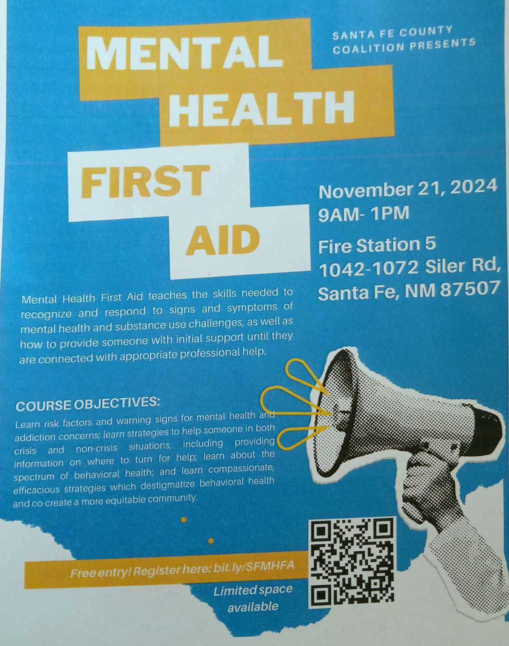 Are you interested in working on outreach to Santa Fe's unhoused population? If so, please consider signing up for this upcoming Mental Health 1st Aid Clinic on Thursday, 11/21 from 9am-1pm, presented by the Santa Fe County Coalition.