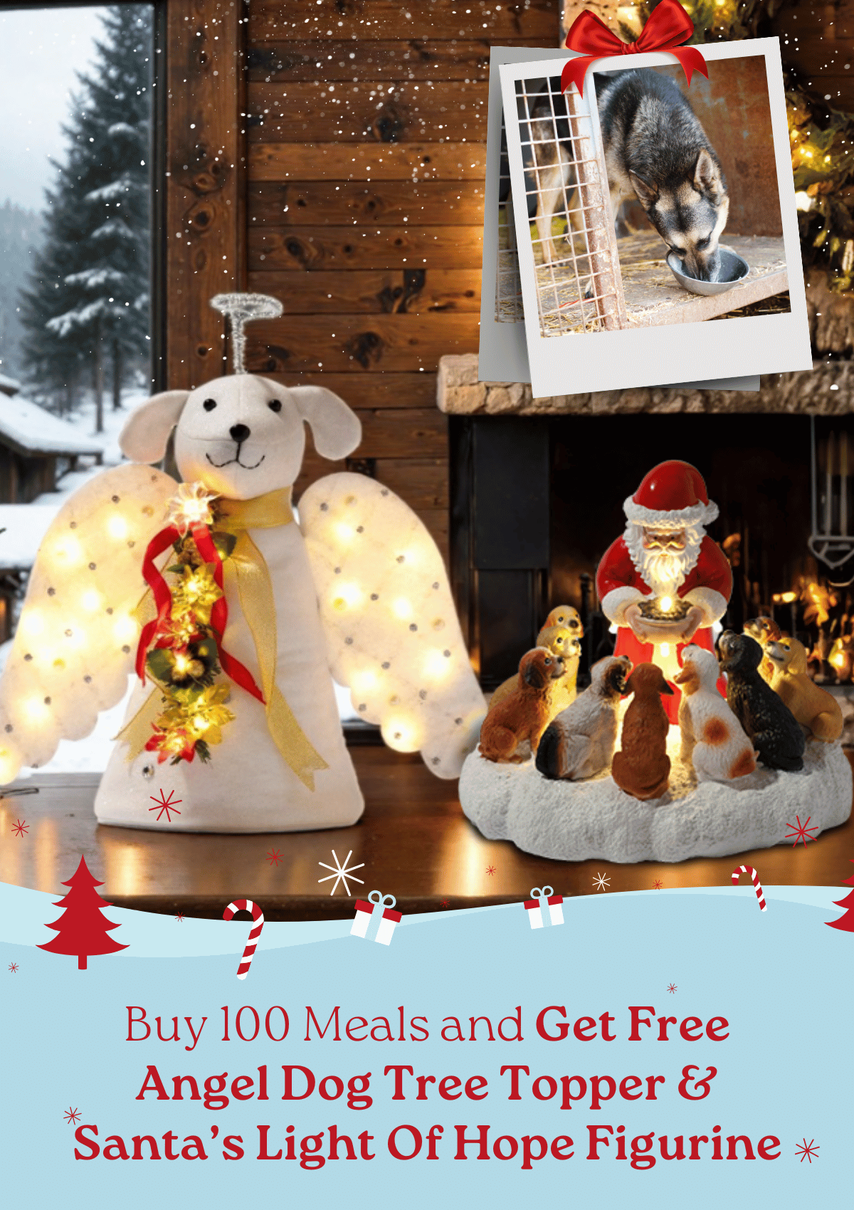 Imagine bringing joy to your holiday season while giving the gift of a full belly to 100 hungry shelter dogs. When you buy 100 meals to support these amazing pups, we’re sending you a little magic back—a beautiful, free ‘Christmas Miracle’ Angel Cat Tree Topper, along with Santa’s Light of Hope to make your holiday sparkle.