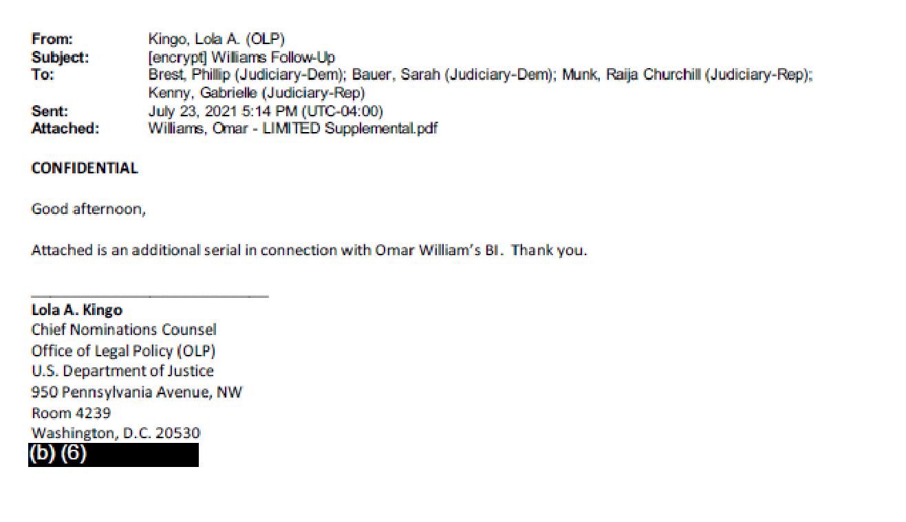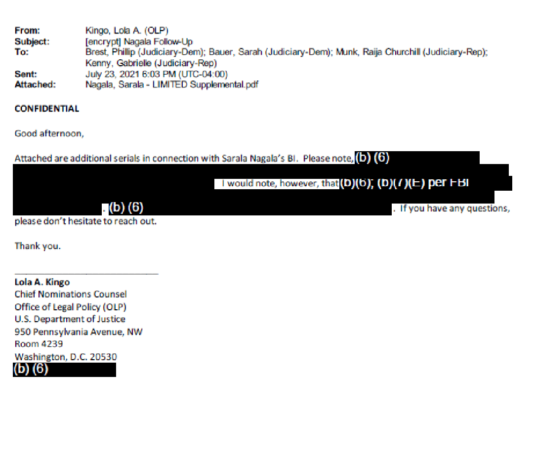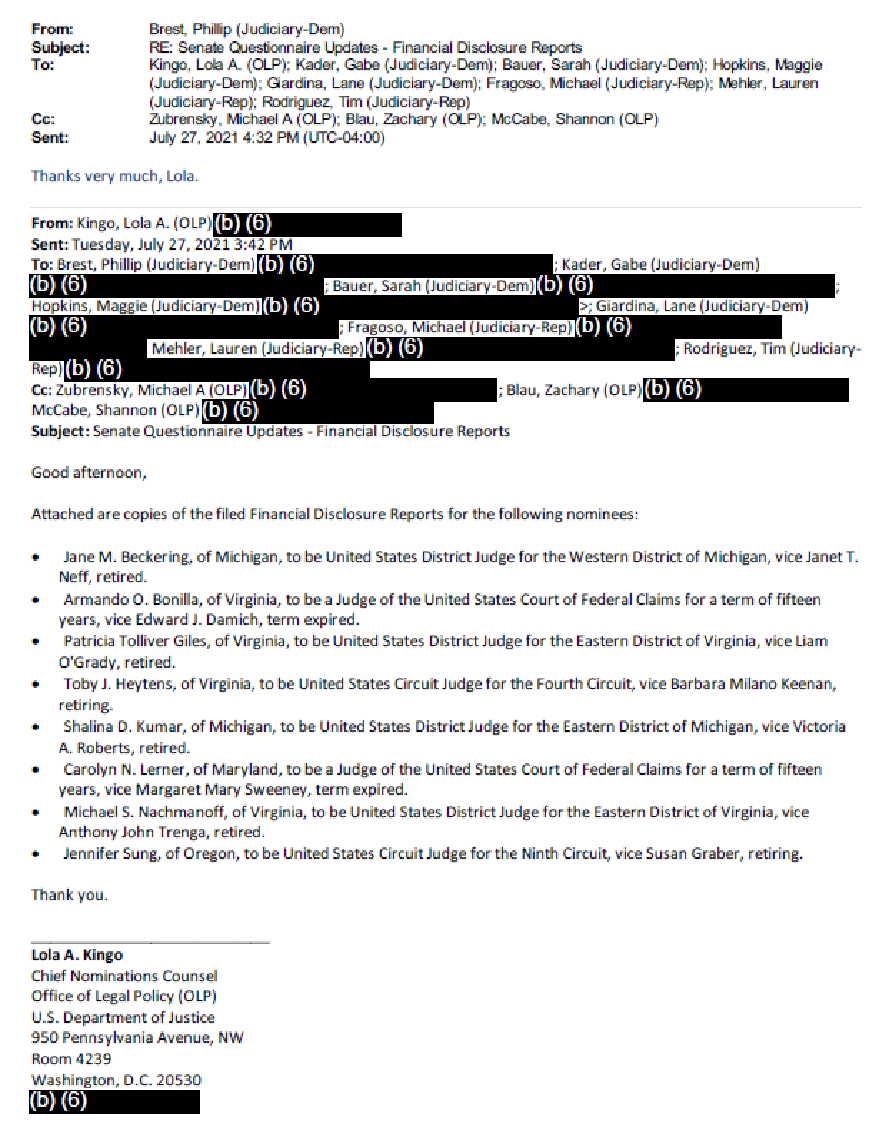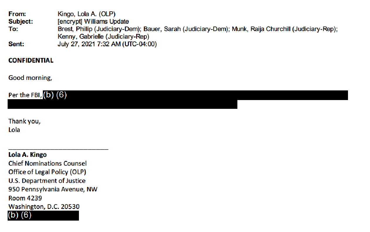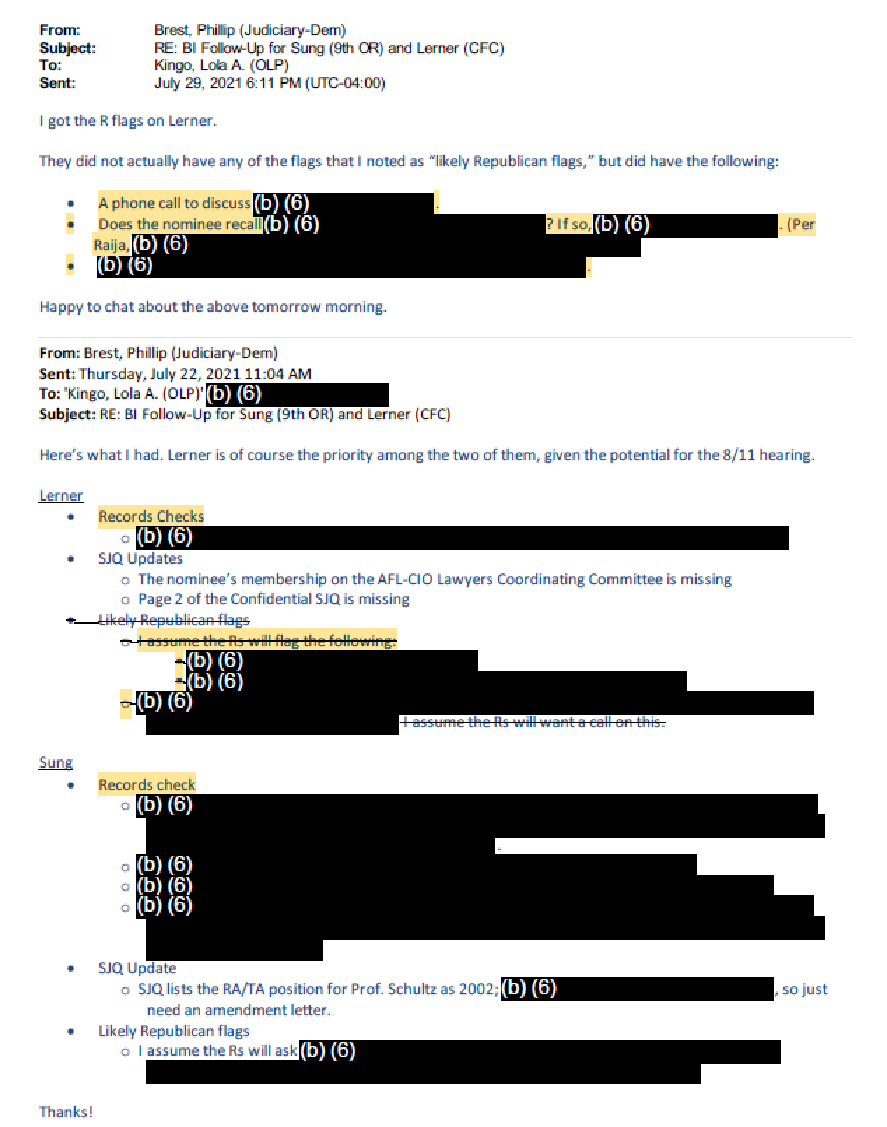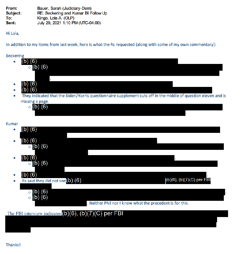 The documents AFL obtained reveal that DOJ officials — who are not signatories to any agreement with the Senate Judiciary Committee — appear to have repeatedly shared BI and personal financial information with Senate Judiciary Committee staffers: