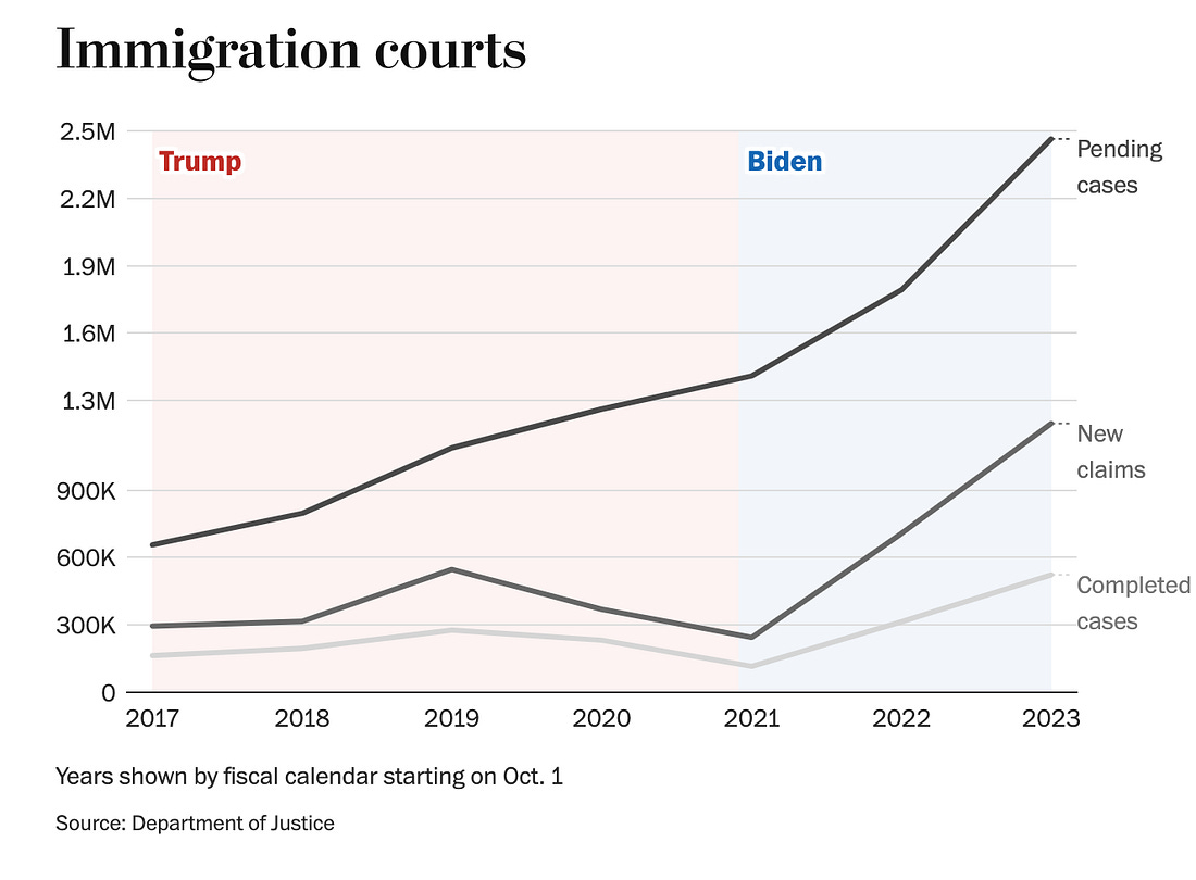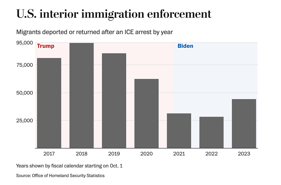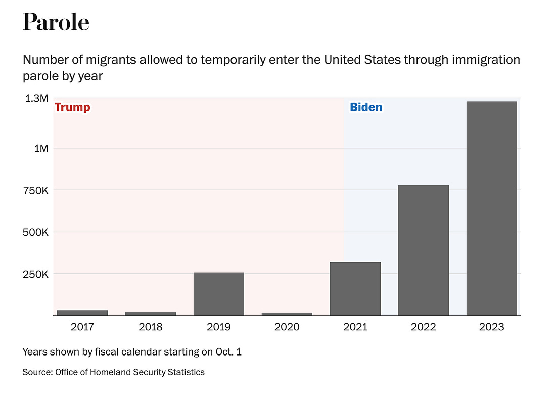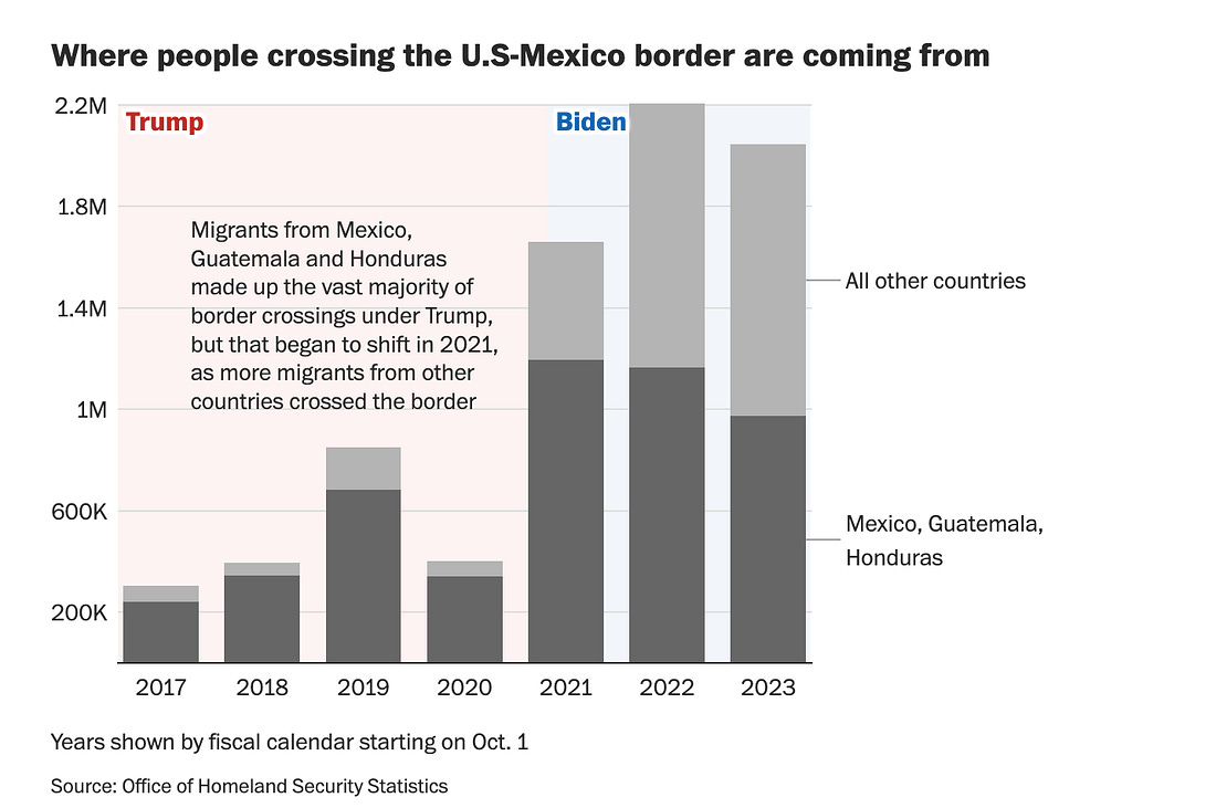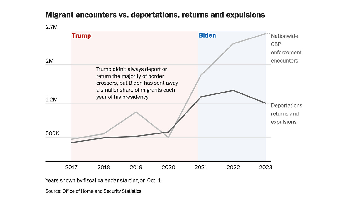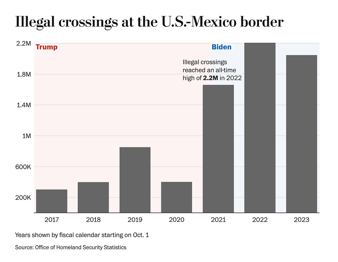 Legal immigration is good. Illegal immigration is bad.If Democrats wanna win next time, we better start shouting it from the port of Ellis Island to the halls of Congress.Liberal patriotismOne of my favorite things about Obama is that he deported millions of illegal immigrants.¹ That took real courage as a Democrat. He didn’t do it because he’s a fascist or a sadist; he did so — as humanely as he could — because he’s a patriot. Barack recognized that this blessed American story only endures if all Americans feel a strong sense of agency in co-authoring it. Illegal immigration strikes at the core of that sacred right to self-determination. It takes agency away from citizens; strips self-authorship from our communities; and corrupts our national character — not racially, but morally — by rewarding cheating and punishing integrity. It is bad. I am actually bored by the economic debate: whether illegal immigrants depress working class wages², reduce inflation³, pay more in taxes than they get in services⁴, or drive up the cost of housing.⁵ Instead, I’m driven by a deeper, cultural truth: The United States is not an economic opportunity zone. We’re a nation. And nations enforce barriers to entry and set standards for membership, period. When we don’t, we become more divided, less generous, and less secure. That’s why the Biden-Harris administration's treasonous disrespect of American borders and American security didn't just alienate white Republicans. It also enraged naturalized citizens and liberal patriots like me. Political failure, illegal excessWe absolutely need migrants for essential labor in agriculture, services, hospitality, and construction — and I hate it when the media calls these workers “unskilled.”⁶ Congress must create guest worker programs and legal visas, with legal pathways to citizenship. And if we fail, whether it’s Biden’s fault or Trump’s, well, let’s live with the consequences.⁷ Political failure is not an excuse for presidential lawlessness and illegality. Biden didn’t run on a platform of mass illegal immigration to the tune of 10 million encounters since he took office.⁸ If he had, he would have lost in 2020 — bigly. It’s undemocratic for the president to sanction all this illegal migration: Congress didn’t authorize it, and I sure as hell never voted for it. It’s also the border, stupid?I predicted on Sept. 25 that Trump will win because “it’s the economy, stupid.” I didn’t expect him to crush Harris and also win the popular vote. What turned a comfortable W into a historic rout was the reality captured in these WaPo charts below.⁹ They don’t show the full picture, because around 40% of illegal immigrants are visa overstays.¹⁰ Still, it tells the story of this election more vividly than almost anything else: 1 ‘Obama Has Deported More People Than Any Other President,’ ABC News, Aug. 29, 2016. 2 ‘Yes, Immigration Hurts American Workers,’ George J. Borjas, Politico Magazine, Sept./Oct. 2016. 3 ‘Economists Say Increasing Immigration Will Reduce Inflation,’ Stuart Andersen, Forbes, May 4, 2023. 4 ‘The Fiscal Burden of Illegal Immigration on United States Taxpayers | 2023 Cost Study,' Federation for American Immigration Reform (FAIR), March 8, 2023. 5 'The Consequences of Illegal Immigration for Housing Affordability, Government Budgets, and American Workers,' Steven A. Camarota, Prepared Testimony to the U.S. House Oversight and Accountability Committee, Subcommittee on National Security, the Border, and Foreign Affairs, Sept. 25, 2024 6 ‘Industries of unauthorized immigrant workers,’ Pew Research Center, Nov. 3, 2016. 7 ‘Biden blames Trump for bringing border deal to verge of collapse,’ ABC News, Feb. 6, 2024. 8 ‘How many migrants have crossed the US border illegally?,’BBC Verify, Sept. 29, 2024. 9 ‘Trump vs. Biden on immigration: 12 charts comparing U.S. border security,’ The Washington Post, Feb. 11, 2024. 10 ‘Visa overstays; the immigration problem that no one is talking about,’ ABC-15, Arizona, Dec 20, 2023. |