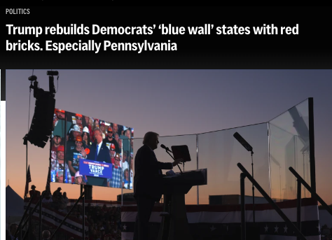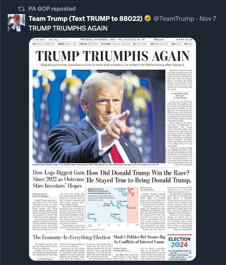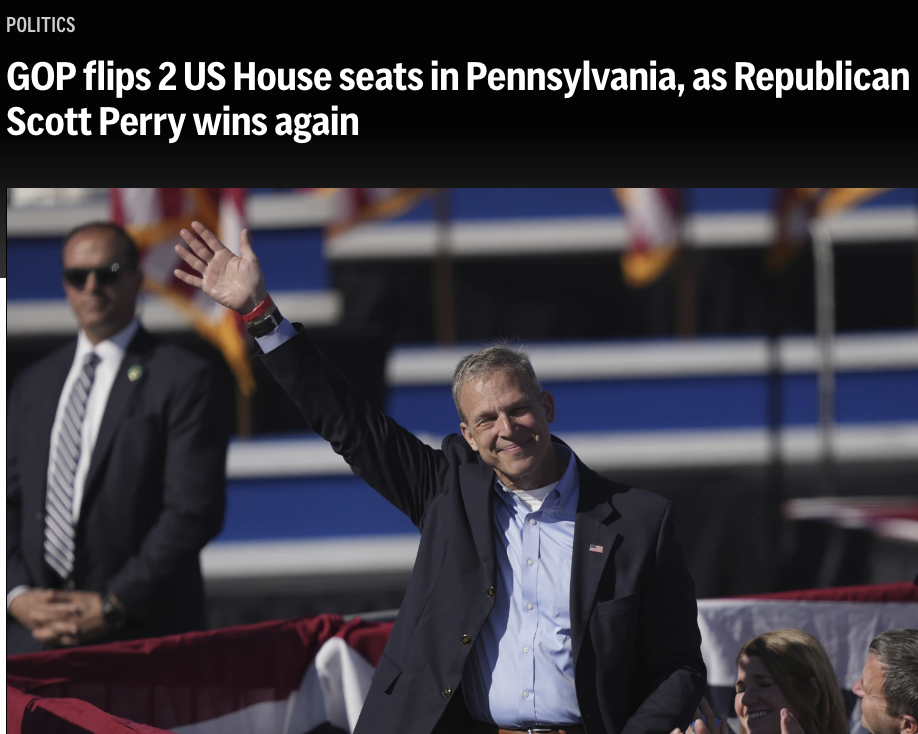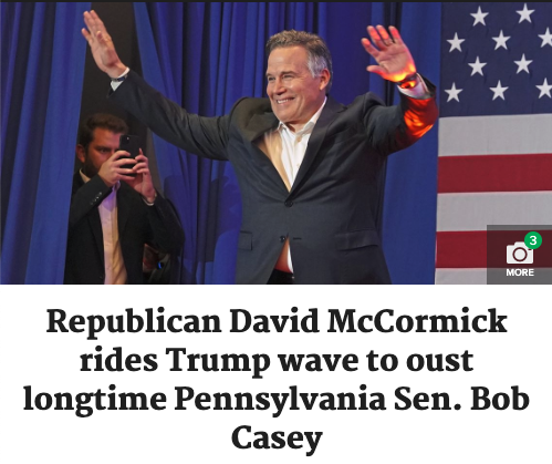 "Republicans landed historic victories in Pennsylvania this week, winning the battleground state’s valuable presidential electoral votes, posting a two-seat gain in its U.S. House delegation and sweeping all four statewide offices on the ballot, including a U.S. Senate seat." READ MORE... |