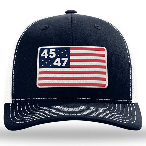 A beautiful American flag leatherette patch with the numbers 45 & 47 to honor President Trump's re-election!