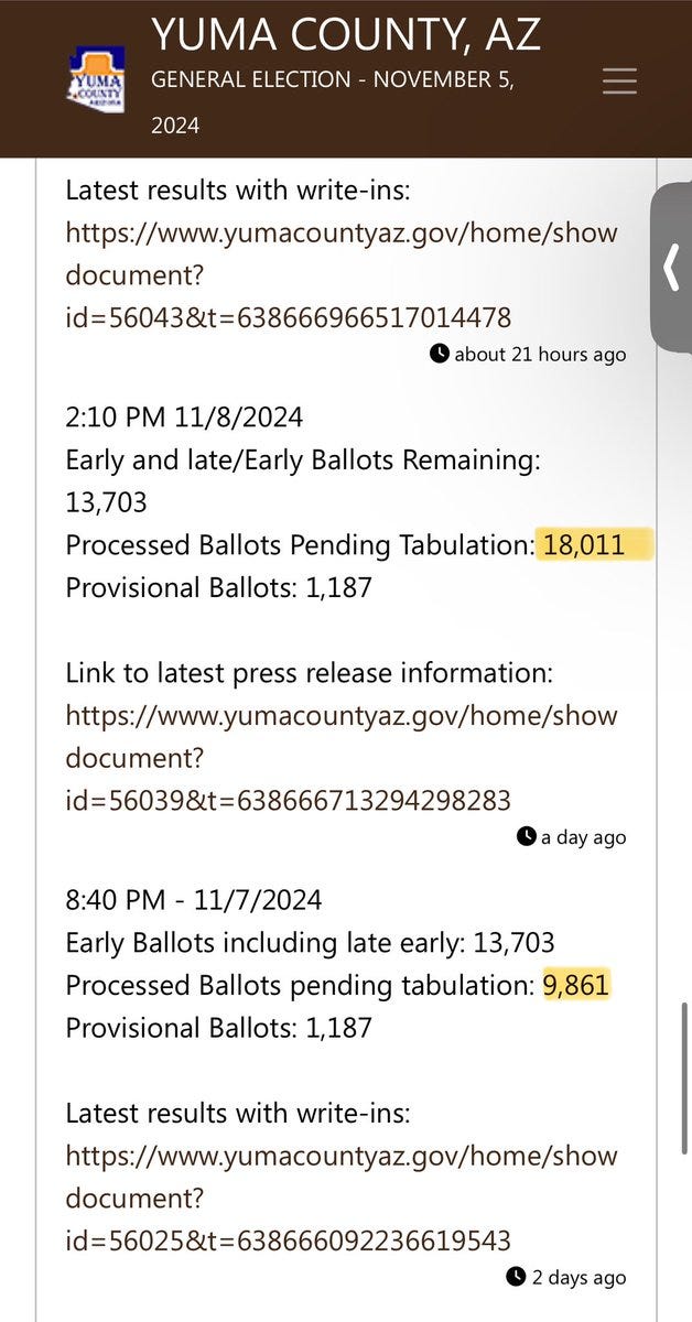 Just like we witnessed in the 2022 Arizona election, election officials are openly changing the ballot totals remaining to be counted without explanation. In 2022, Democrats swept the state-wide elections despite Republicans having the strongest set of candidates in recent history. Kari Lake was so impressive and polished that she made a name for herself nationally prior to the race. But on Election Day, Maricopa County officials sent the wrong-sized paper to the precincts, essentially shutting down voting across the metro Phoenix area, especially in deep-red districts. Democrats were somehow able to pick up over 50% of the votes that day despite having only a 17% turnout. Then, following Election Day, 25,000 mysterious and still unexplained ballots were inserted into Maricopa County’s totals. This was never investigated or explained. Kari Lake filed a historic lawsuit on Friday to nullify the Stolen 2022 Midterm Election for Governor. The 2022 election was similar to a 2020 election where investigators found that hundreds of thousands of 2020 election ballots also lacked the necessary chain of custody documentation. The filing also states that 25,000 ballots were added to Maricopa County’s totals after election day. This could explain why Democratic candidates won over 50% of election-day votes despite only recording 17% of the turnout. Some Things Never Change Election officials in Arizona are once again changing the ballot totals as the US Senate Seat has yet to be called. President Trump won the state 52.7% to 46.4% over Kamala Harris – a SIX POINT spread! But the officials in Arizona want you to believe that a majority of Arizona voters voted for Trump, and then a majority voted for the open borders communist, Ruben Gallego, the son of a cartel attorney. The Kari Lake campaign fired off a letter on Friday to Pima County officials after they were caught changing the ballot totals this week in Pima County! According to the Lake Campaign attorneys, the uncounted ballots went up by 14,666 on Friday, November 8, between the reports listed as uploaded at 1:23pm MST (Exhibit B) and 3:23pm MST (Exhibit D). Here is our report on Pima County from Saturday. Now there is a new development. It's NOT just Pima County that is adding ballots to their totals following election day. Yuma County DOUBLED its remaining ballot count from Thursday to Friday! Liz Harrington reported: