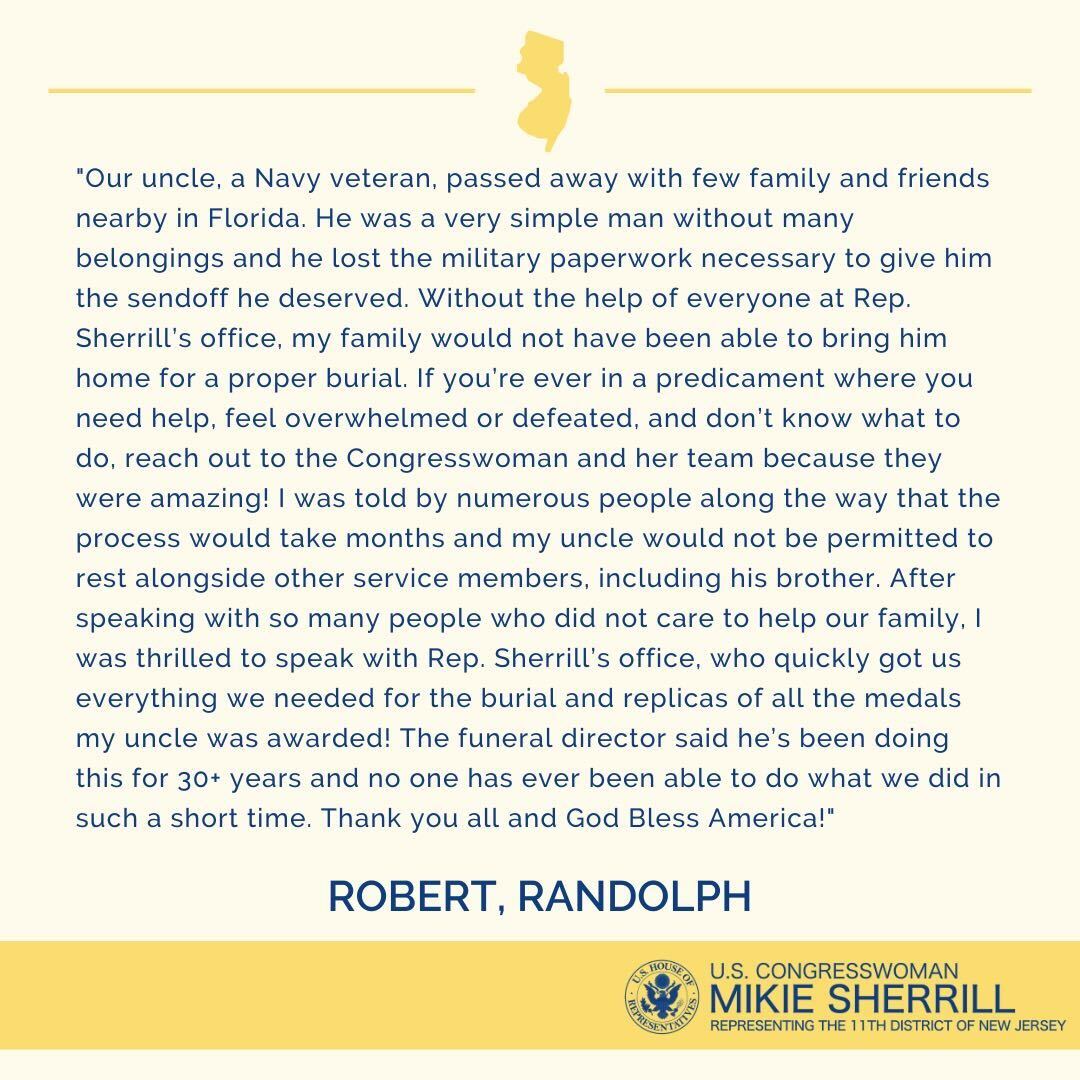 A Message from Congresswoman Sherrill | Dear Friends, On Veterans Day, it’s critical that we take the time to honor those who have answered the call to serve our nation. Since the Revolutionary War, men and women from New Jersey have stepped up to fight for, protect, and defend our democracy and the freedoms we hold dear. Today, I want to thank all of our New Jersey veterans – and their families – for their service to our country. We can never fully repay our veterans the full debt of gratitude they are owed, but we have an obligation to do our part. As a proud Navy veteran, I remain laser focused on ensuring that New Jersey’s veterans have access to all of the resources and support they need to be able to thrive when they transition to civilian life. Continue reading below to learn more about some of my recent efforts to expand job opportunities, mental health resources, and cancer screenings for our veterans. Additionally, my office is always here to help our veterans in need – visit my website or call my office at (973) 526-5668 if you are in need of assistance with VA benefits. P.S. I hope you’ll join my office in our fourth annual Thanksgiving Thank Yous for Veterans, where we write holiday cards to distribute to veterans across North Jersey! Learn more here. | Rep. Mikie Sherrill Member of Congress | | Expanding Access to Veterans Mental Health Care in Northwest NJ | For years, veterans and veterans advocates in North Jersey have been working tirelessly to expand mental healthcare access to veterans in Northwest New Jersey with a new Vet Center. That’s why, as part of my Jersey STRONG agenda, the first five bills I introduced in this Congress, I introduced the bipartisan Vet CENTERS for Mental Health Act to use census and VA data to identify where expanded Vet Center access is needed – including in places like northwest New Jersey. Back in April, we welcomed Veterans Affairs (VA) Undersecretary for Health Dr. Shereef Elnahal to Morristown to open the VA’s new Community Access Point in Morristown and establish a Vet Center Outstation in Hackettstown. While I will continue to keep fighting hard to bring a full Vet Center to our region, I am glad to see that these two sites are providing care to veterans in our community. If you are a veteran looking to schedule an appointment at the Morristown or Hackettstown counseling sites, call the Bloomfield Vet Center at 973-748-0980 to set up an appointment at the location most convenient to you. | Helping Veterans Get Good-Paying Jobs | The transition from military to civilian life for many of our service members is not an easy one – and it’s our responsibility to ensure that no veteran is left behind. That’s why I introduced bipartisan legislation to connect service members transitioning to civilian life with apprenticeship and job training programs, as well as colleges and universities across New Jersey. My legislation will help to ensure that veterans are able to succeed once leaving the armed forces while addressing the workforce shortages businesses are facing across the Garden State. | | Preventing Veteran Suicide with Secure Firearm Storage | Earlier this year, I introduced the Secure Storage Information Act, legislation that will expand access to secure storage information and reduce the cost of purchasing secure storage devices for gun owners. The bill will make it significantly easier for veterans to safely store their firearms at home – through expanded information, better access to storage devices, and lower costs – which in turn will help to reduce accidental shootings and firearm deaths. I hosted a roundtable discussion with local gun safety advocates, law enforcement, veterans, elected officials, and community members to talk about the importance of this legislation. Secure storage is a key method in reducing veteran suicide – with one in three veteran firearm owners storing at least one firearm unlocked and loaded in their homes. Expert studies have shown that secure storage is critical to providing time and space for suicidal impulses to pass, serving as a buffer so individuals can seek help. | Two years ago I fought to pass the PACT Act to give veterans who have been exposed to toxic burn pits better access to healthcare and benefits. Since being signed into law by President Biden, the PACT Act has provided over one million veterans exposed to toxic burn pits with cancer screenings and appropriate care. Visit the VA’s website to learn more about how to sign up for benefits if you are eligible. | My team works hard every day to provide services for citizens all across NJ-11. Many of these individuals are veterans, and here is one of their stories. My team was honored to help Robert when he needed help ensuring his family member had his hard-earned military honors at his funeral.