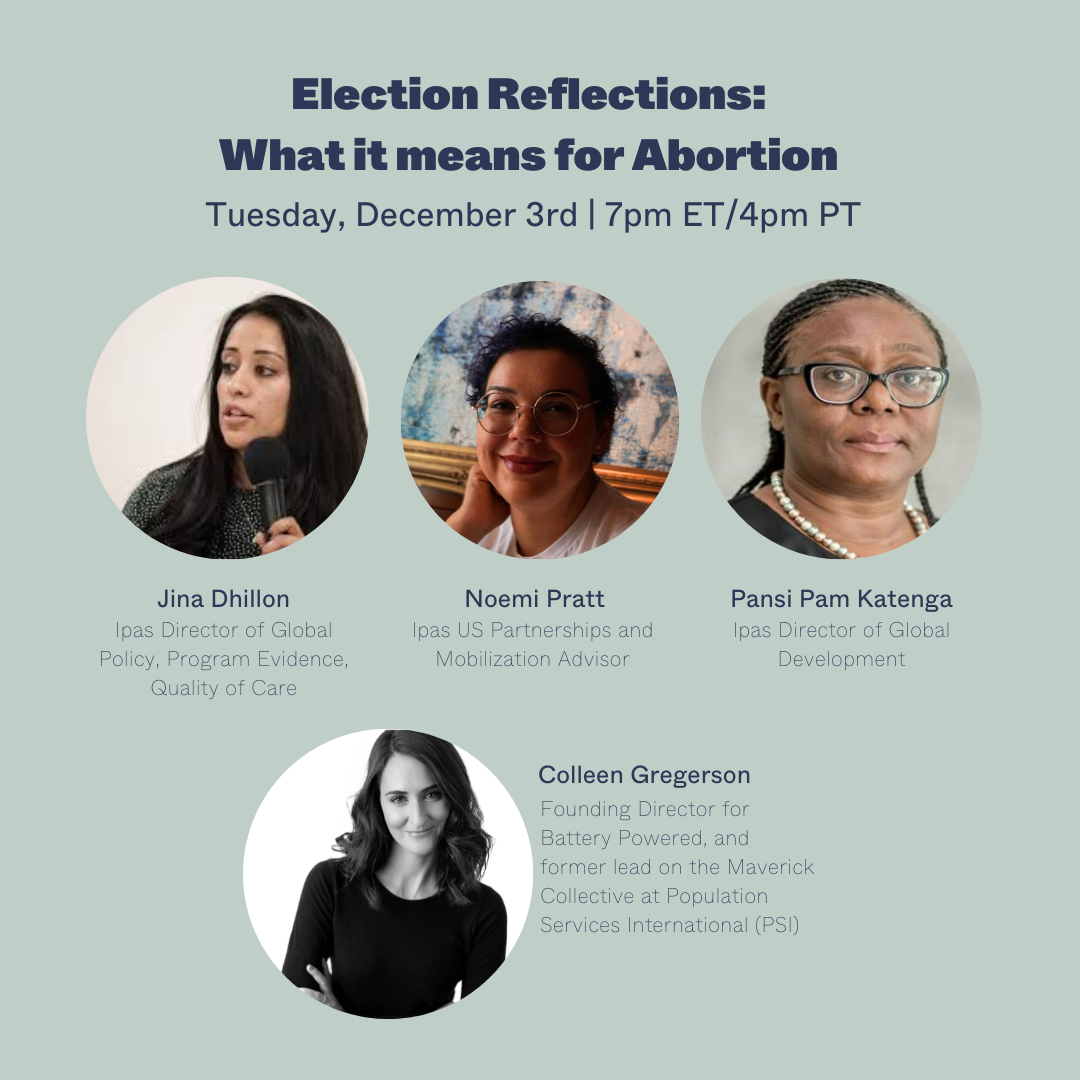 A friendly reminder to join us tomorrow, December 3rd, for a conversation with expert Ipas staff. We'll dive into what a new Trump administration means for abortion access and rights—here in the U.S. and around the world. More importantly, we'll discuss how we can move forward to protect reproductive rights and provide access.