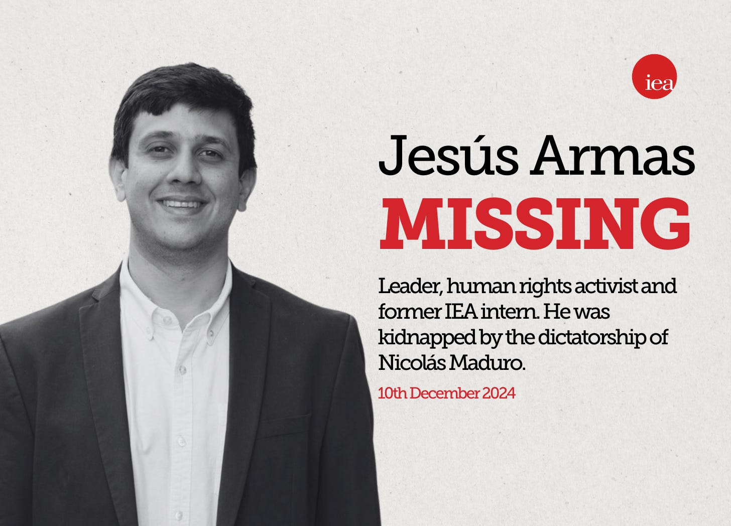Jesús Armas - another voice for liberty silenced in VenezuelaA vocal supporter of freedom and democracy, and former IEA intern, has been arbitrarily detained in VenezuelaJesús Armas, a former intern of the Institute of Economic Affairs and graduate of the University of Bristol, is missing in Venezuela. Jesús, a human rights activist and social leader who spoke out for freedom and democracy, was arbitrarily detained on December 10, 2024, at 9:19 PM Caracas time. Six masked agents forcibly took him in an unmarked silver Toyota Fortuner SUV. It is believed that Jesús is being held at El Helicoide, a well-known torture centre in Caracas, under the custody of SEBIN, Venezuela's political police. However, the Venezuelan authorities have failed to confirm his whereabouts. His status remains that of enforced disappearance. Jesús played an important role in the opposition campaign during the July 28 presidential elections, in which Nicolás Maduro was defeated. Maduro has refused to recognize the result and launched a brutal crackdown on opposition figures. Jesús is an Obama Foundation scholar and spent time in the UK as he received a Chevening Fellowship to complete his master's degree at the University of Bristol (2019–20). He worked with us at the IEA as an intern in 2020, and is remembered very fondly by everyone who worked alongside him. Our former colleague Emma Revell has written about his application to be an intern, when he was already an established political actor in Venezuela. He wanted to come to the IEA because it was, as far as he was concerned, the home of the liberty movement. During that time we learned much from him. He spoke on the IEA YouTube channel about what was happening in Venezuela. Previously hailed as being a socialist utopia by many - including Jeremy Corbyn - it has long been a despotic regime in reality. Jesús has previously written from hiding about the repression faced by opposition campaigns in Venezuela, including the imprisonment of campaigners and the shutting down of establishments such as hotels and restaurants that served them. Opposition activists have collected the evidence that proves that Edmundo González was elected, winning 4 million more votes, over Maduro. Anyone can see that evidence here. But rather than accept defeat, Maduro has resorted to state terrorism to silence these voices, the latest of whom we at the IEA know well. “The democratic world’s solidarity is essential to reclaiming Venezuela’s freedom” - Jesús Armas Jesús said “the democratic world’s solidarity is essential to reclaiming Venezuela’s freedom”. We have written to the Foreign Secretary David Lammy and the British Embassy in Venezuela to make representations to the Venezuelan authorities for the immediate release of Jesús and others like him who have been arbitrarily detained. Jesús’ case is one of over 2,000 arbitrary detentions recorded since the election. Many have faced torture or worse. He saw the United Kingdom as a beacon of liberty in the world. We need to be that now. You’re currently a free subscriber to Insider. For the full experience, upgrade your subscription. Paid subscribers support the IEA's charitable mission and receive special invites to exclusive events, including the thought-provoking IEA Book Club. We are offering all new subscribers a special offer. For a limited time only, you will receive 15% off and a complimentary copy of Dr Stephen Davies’ latest book, Apocalypse Next: The Economics of Global Catastrophic Risks. |