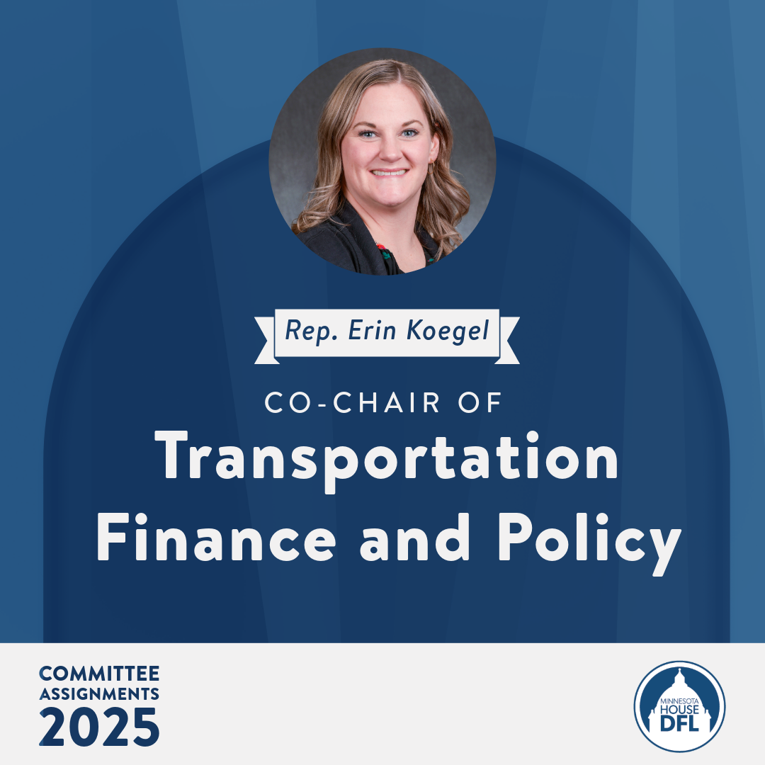Recently, Leaders Hortman and Demuth announced co-chairs, and I am honored to have been appointed co-chair of the House Transportation Committee. The 2023 transportation budget package was transformative - with the DFL trifecta delivering needed sustainable revenue for our underfunded multimodal transportation system and enacting important safety and equity measures. I am looking forward to working with our committee to advance on the progress we made the last two years.