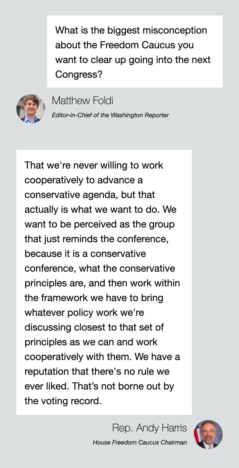 The Freedom Caucus, Harris said, has an unfair reputation for failing to act as a team player. “It’s a misconception,” he said, “that we're never willing to work cooperatively to advance a conservative agenda. We want to be perceived as the group that just reminds the conference, because it is a conservative conference, what the conservative principles are, and then work within the framework we have to bring whatever policy work we're discussing closest to that set of principles as we can and work cooperatively with them.”