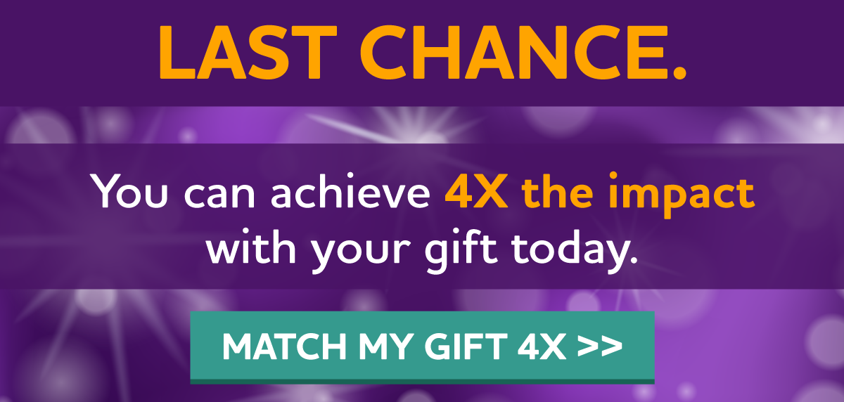 P.S. The next few hours are critical. Our Year-End 4X Match Challenge ends tonight at midnight. Please make your generous first gift while you can still QUADRUPLE your impact to help provide care and support and move research forward into the new year and beyond. Your gift may even be tax-deductible. Happy New Year to you and yours and thank you so much.