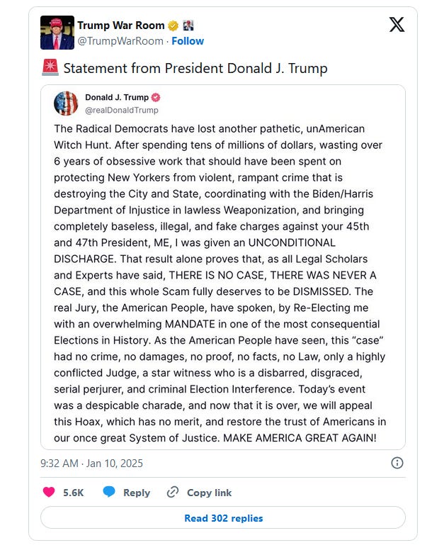Justice Juan Merchan sentenced President-elect Donald Trump to an unconditional discharge in the Manhattan business records case on Friday, which does not penalize him, though it upholds the jury’s felony conviction. Trump declared that the sentence itself proved the case must be dismissed . “That result alone proves that, as all Legal Scholars and Experts have said, THERE IS NO CASE, THERE WAS NEVER A CASE, and this whole Scam fully deserves to be DISMISSED,” he wrote in post on Truth Social. “The real Jury, the American People, have spoken, by Re-Electing me with an overwhelming MANDATE in one of the most consequential Elections in History,” he added. Trump made it clear Thursday night that he intended to appeal the case after the U.S. Supreme Court denied his effort to stay the sentencing. “For the sake and sanctity of the Presidency, I will be appealing this case, and am confident that JUSTICE WILL PREVAIL. The pathetic, dying remnants of the Witch Hunts against me will not distract us as we unite and, MAKE AMERICA GREAT AGAIN!” Trump wrote in part. The Associated Press previously reported that Merchan, who imposed a sweeping gag order on Trump throughout the trial, was expected to sentence Trump with an unconditional discharge. Trump–who did not take the stand and was gagged from speaking about witnesses, including his disgraced former attorney Michael Cohen and adult film star Stormy Daniels, as well as counsel in the case other than Manhattan District Attorney Alvin Bragg–addressed the court virtually from Mar-a-Lago. “I assume I’m still under a gag order,” Trump said, per the New York Times’s Maggie Haberman. “But the fact is, I’m totally innocent.” He criticized prosecutor Matthew Colangelo, an ex-Biden official who joined Manhattan District Attorney Alvin Bragg’s office, and Cohen, who he called a “totally discredited person,” per Haberman’s reporting from the courtroom. Prosecutors in Bragg’s office had initially hoped to freeze sentencing for the duration of Trump’s term, which would have meant he could potentially be sentenced to prison time once he left office. Trump’s legal team sought to have the case dismissed and the verdict vacated, citing the Presidential immunity doctrine, the Presidential Transition Act, and the Supremacy Clause, among a number of other arguments in a 72-page motion, which Merchan denied. You're currently a free subscriber to PatriotNewsToday. For the full experience, upgrade your subscription. |