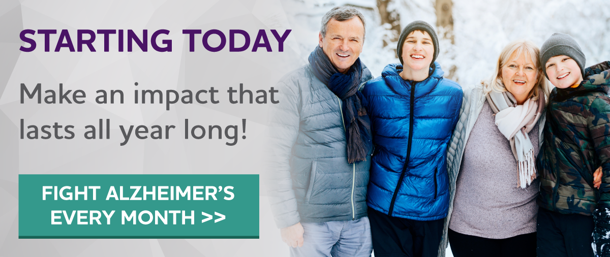 Today, you can make a powerful commitment in the fight against Alzheimer's. By joining our community with ongoing support, you will bring hope and real help to those who need it most. Our monthly supporters are the foundation of our ability to deliver care and support to families impacted by Alzheimer's and advance critical research all year long. Will you join this group of like-minded leaders today and give in the most powerful way possible?