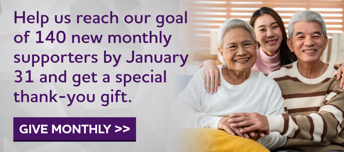 I'm asking you to start off the new year with a resolution that is easy, convenient and immensely effective. When you sign up now, we'll also send you our signature purple journal as a small way to say thank you. Will you make a powerful and sustaining impact as a monthly supporter?