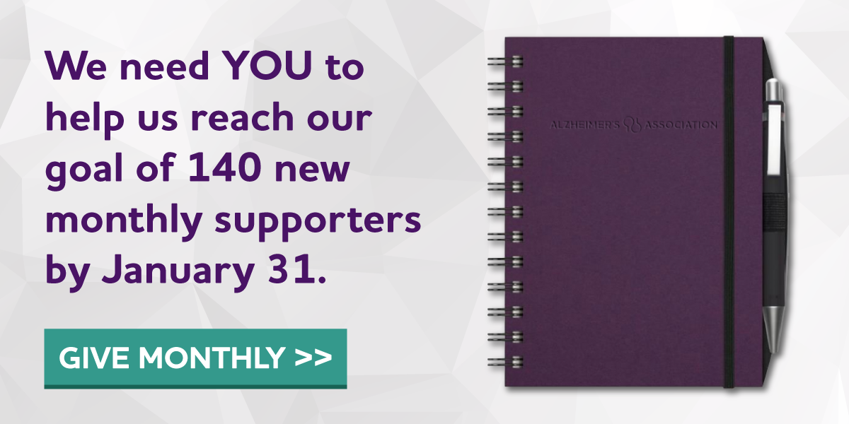 Giving monthly can be a small way to make a big difference. You're in control of the commitment you make. The amount you give each month is up to you, and you can change it at any time. But the moment you become a monthly supporter, at any level, you'll help further our mission to lead the way to end Alzheimer's and all other dementia — by accelerating global research, driving risk reduction and early detection, and maximizing quality care and support.