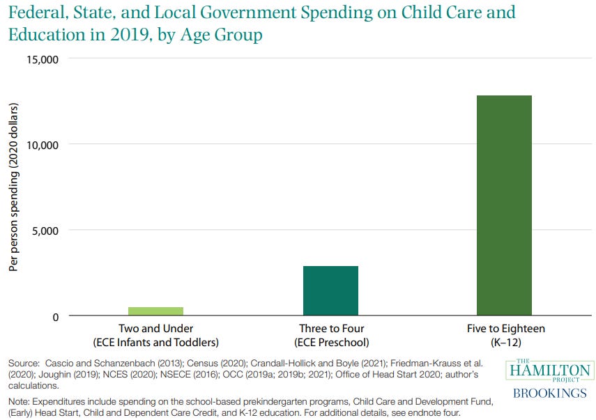 This week we have a guest author: Elliot Haspel is a nationally recognized child and family policy expert and commentator, a senior fellow at Capita, and the author of Crawling Behind: America’s Childcare Crisis and How to Fix It (Black Rose, 2019) and the forthcoming Raising a Nation: 10 Reasons Every American Has a Stake in Child Care for All (Oxford University Press, 2025. You can read more from him on his Substack, The Family Frontier. Childcare is a sector in flux. Since the 1960s, when mothers of young children first began entering the external labor force in large numbers, it has been treated largely as a market good as opposed to a social good akin to schools, libraries, and parks. After the failure of the 1971 Comprehensive Child Development Act, federal policy has considered childcare as a private good, primarily providing access as a component of the welfare system, leveraging vouchers that further marketize the sector. However, childcare does not and cannot effectively function as a market; indeed, it is what former US Treasury Secretary Janet Yellen calls a “textbook example of a failed market.” While there are surely areas of needed regulatory reform, we cannot deregulate or demand our way out of immutable market failure. Instead, a robust public investment in supply-side interventions is essential. A larger public role for childcare is crucialQuite simply, childcare markets do not and cannot effectively meet the needs of children, parents, providers, communities, and the economy. Childcare markets don’t work because even with high demand, few consumers can bear the true cost of operating high-quality programs. Childcare markets don't work because quality is important yet difficult to discern, and with limited supply consumers can hardly take their business elsewhere. Childcare markets don't work because parents don't have years to save for childcare tuition, and you couldn't get a loan for childcare if you tried. With so many market failures resting on a fundamental miscasting of childcare as a merely instrumental service, the only path toward abundance is through robust public support. Journalist Annie Lowrey put it well when she wrote, “the math does not work. It will never work. No other country makes it work without a major investment from the government.” Unfortunately in the US, childcare simply lacks the degree of permanent public funding required to meet parent needs and deliver a consistently high-quality product. The US invests less in childcare, as a percentage of GDP, than most high-income nations. Even when considered in context of US spending on children and families, childcare comes up absurdly short: But more money in the system is not enough on its ownWhere and how that money flows matters. For instance, expanding supply by building or expanding facilities is difficult and would-be childcare providers face a steep climb because there is very little funding available for start-up costs or capital improvements. The Child Care and Development Block Grant, the main source of US childcare funding, statutorily prohibits recipients from using the funds to purchase land or conduct major construction activities. The lack of widespread capital is doubly problematic because childcare facilities can, when well-supported, serve as important community assets and social infrastructure. What’s more, access to capital is one reason why investor-backed for-profit chains, including those owned by private equity firms, have a distinct competitive advantage. The more that nonprofit and community-based providers struggle with capital scarcity, the more market share that profit-maximizing entities are likely to gain; and if the history of private equity in other human services is any guide, this bodes poorly for American children and families. While more capital is important, childcare costs are concentrated in wages—not because providers earn high wages, but because it takes many staff to do the hard work of cultivating young developing bodies and brains. Increasing voucher reimbursement rates may have a modestly positive indirect effect on provider wages, but childcare educator pay remains among the lowest 5 percent of all occupations, leading to high turnover and widespread shortages. Since both adequate facilities and staff are prerequisites for a childcare program’s legal operations—to say nothing of quality that promotes child development—the lack thereof is a direct supply constraint. Deregulation cannot solve market failuresIn the face of low childcare supply, there have been increasing calls—on both sides of the aisle —for deregulation, ostensibly based on a theory that overregulation is choking supply. This is a place to hold two truths in tension: There are legitimate steps that need to be taken to modernize childcare regulations and smooth the path for provider openings, and deregulation cannot solve childcare’s fundamental market failure. There certainly are some regulations that need revision, whether extraneous zoning requirements that delay licensing approval or obsolete regulations such as an Illinois mandate that providers carry coins on walks to use pay phones in case of emergency. However, the regulations that most significantly drive costs should be considered nonnegotiable: those related to health and safety, and in particular the need to maintain low child-to-adult ratios. As advocate and childcare communications expert Katie Albitz has explained, too much deregulation can actually work counter to the building of a holistic, healthy system: “Deregulation creates unsafe conditions, then [opponents can exploit] the danger and tragedy that follows to erode public support, weakening the case for government investment and demonizing mothers who rely on it.” A well-designed regulatory system is particularly crucial in maintaining quality and trust for a sector where the individuals being served are often preverbal or otherwise una