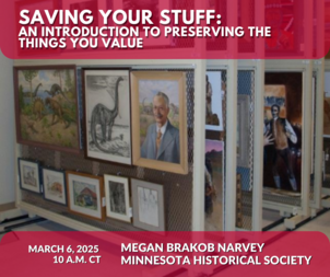 Whether you're caring for art, family heirlooms, memorabilia collections, or historic archives, the basics of preservation are the same. In this presentation, Megan Brakob Narvey the Outreach Conservator at Minnesota Historical Society, explains the "ten agents of deterioration" and how to preserve and protect the things you value - whatever they are! The presentation will include time for questions and answers and recommendations for finding additional resources. This presentation serves as an introduction to preservation for those volunteering, new to the field, and those who are new to preserving personal objects for future generations. Additionally, others may benefit from a refresher on the basics.