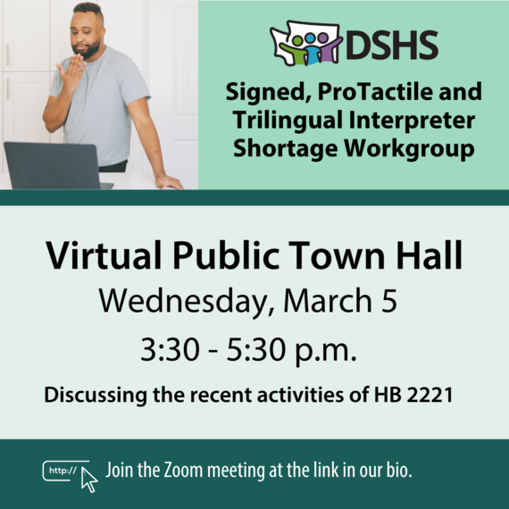Join us on Wednesday, March 5, 2025, from 3:30 to 5:30 p.m. to learn about the recent activities of the HB 2221 Washington Signed, ProTactile, and Trilingual Interpreter Shortage Workgroup. The Department of Social and Health Services will share the workgroup's proposed solutions, outline the next steps in developing the legislative report, and provide an overview of actions the community can take once the report is submitted to the legislature. We look forward to seeing you there!