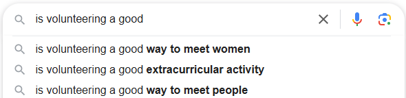 So Nevada is way an outlier on all of this. 8 The percentage of people born in-state who live in-state is a highly inexact way of getting at whether someone has community or not. Lots of transplants build incredible communities, and of course lots of people who live in their hometowns are lonely. But it’s one of the easier ways to look at this, and I don’t necessarily think it’s an accident that Nevada is at the bottom of both. 9 How you define loneliness is pretty challenging, so this is just one way of looking at it. Different people come to different conclusions by defining loneliness in different ways and weighting different measures. Some, of course, just make it up entirely. But the definition I used was backed by at least some data. 10 Just to be clear: this is about meeting friends, despite what Google thinks you have in mind when you’re asking about meeting people while volunteering: (By the way, if you’re wondering, the internet seems to think… yeah, maybe it is.) 11 Fourth graders at the beginning of the pandemic are in high school now. And that definitely makes me feel old… It’s wild that it’s been five years—it still messes with my sense of time. Ben Samuels is free today. But if you enjoyed this post, you can tell Ben Samuels that their writing is valuable by pledging a future subscription. You won't be charged unless they enable payments. |