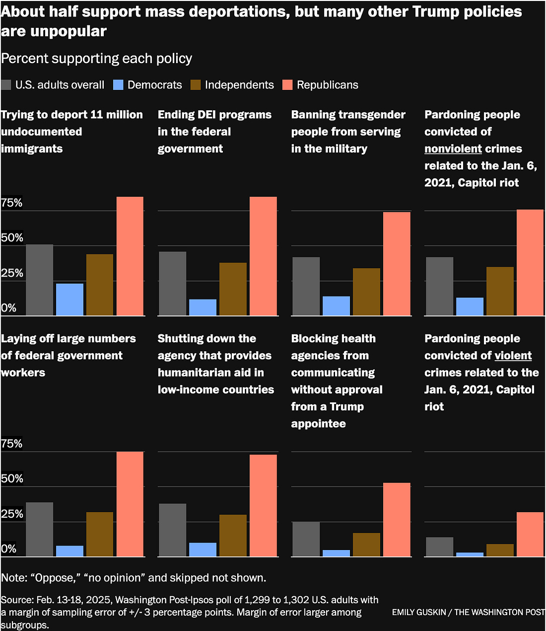 Trump's approval ratings go south-- fastTrump's support crossed the rubicon this week, flipping from net positive to net negative as his honeymoon came to an abrupt end.While it slowly erodes my soul to admit that Trump had enjoyed a net positive approval rating up to this point in his presidency, you might find some solace in the fact that the honeymoon is officially over. According to new polling from Washington Post-Ipsos, Quinnipiac, CNN, and Gallup, Trump’s approval rating is underwater in literally all of them. For Post-Ipsos, it’s 43% approve, 48% disapprove. For Reuters, it’s 44% approve, 51% disapprove. For Quinnipiac, it’s 45% approve, 49% disapprove. For CNN, it’s 47% approve, 52% disapprove. What’s worse, we’re only one month into his presidency. As far as honeymoons are concerned, this is the equivalent of newlyweds getting in their first fight on the way to the airport. The cause for these dismal numbers, unsurprisingly, is Trump shepherding unpopular policies— ones that he didn’t run on but was perfectly content to try and implement only after he was no longer accountable to voters. Per the chart above, public approval is underwater on Trump’s efforts to end DEI programs in the government, ban trans military members from serving, pardon January 6 insurrectionists (violent and nonviolent), effectuate mass firings of federal employees, shut down USAID, and block health agencies from communicating with the American people. The sole issue on which Trump retains a shred of majority support is deporting undocumented immigrants—but there’s a major caveat: