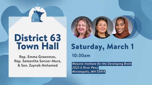 You're invited to a town hall! Please join Rep. Emma Greenman, Sen. Zaynab Mohamed, and me for a discussion on Saturday, March 1st, starting at 10:30 a.m. at the Masonic Institute for the Developing Brain. We hope to see you there!
