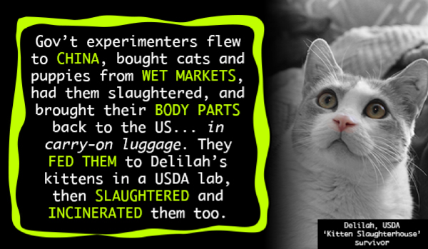 Congress is setting animal testing budgets right now. Without Delilah’s Law, there’s nothing to stop greedy white coats from paying off these cruel, dangerous, disease-ridden markets for another year! You see, they don’t care about the repercussions – like global pandemics, piles of dead dogs, or the sheer waste of it all.