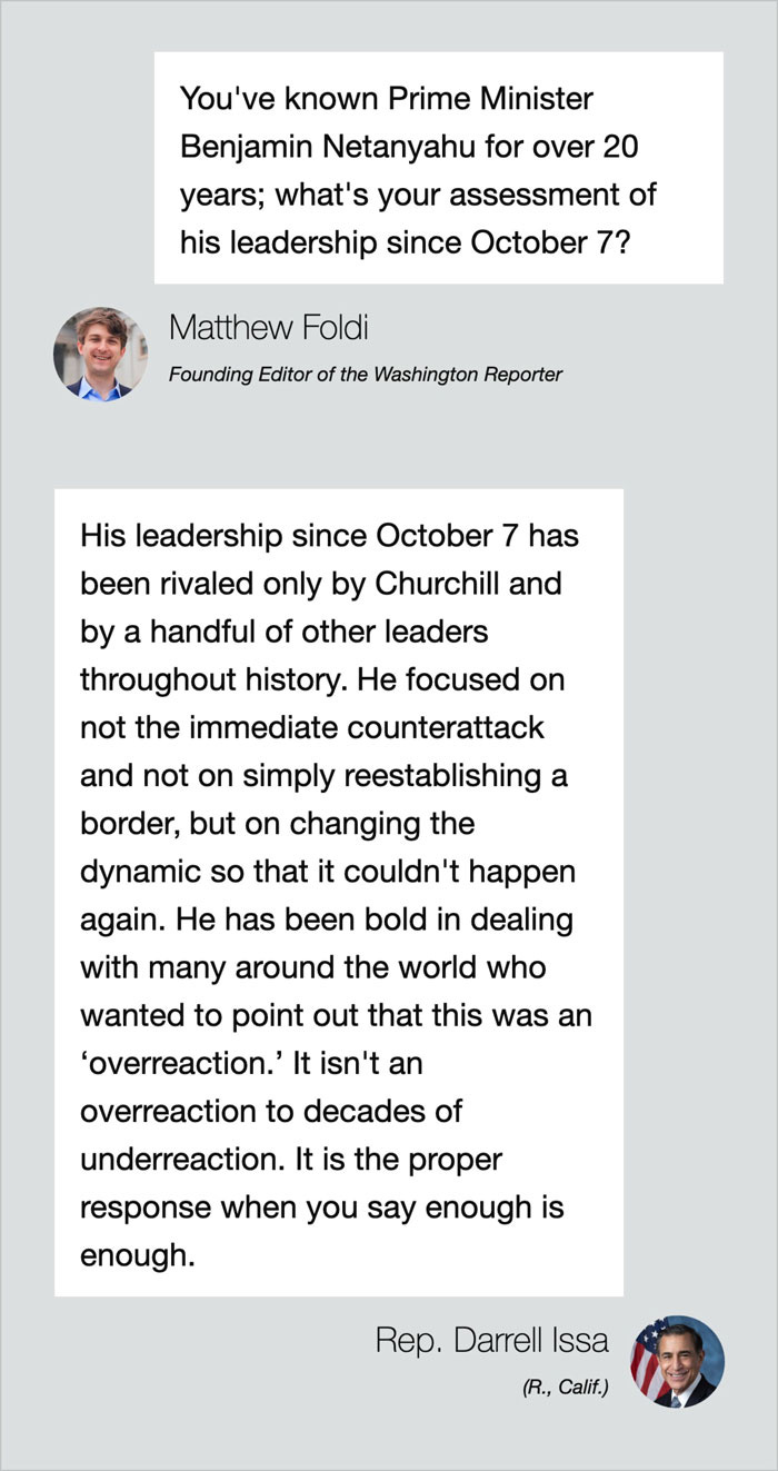 TEL AVIV, Israel — The Middle East will never look the same, following the barbaric attacks on southern Israel by Hamas and other Palestinian terrorists. Rep. Darrell Issa (R., Calif.), the Vice Chairman of the House Foreign Affairs Committee, has had a front row seat, both to the changes since October 7 and over the past several decades. Issa — who on that fateful October 7 day was set to fly to Israel from Saudi Arabia — told the Washington Reporter in an exclusive interview in Tel Aviv that the changes on the ground are extensive. “What we've seen is the vulnerabilities that we were told existed come to pass,” he said. “We've seen Syria fall. We've seen Hamas be diminished. We've seen Iran in free fall, looking to others to prop them up. We've also seen during that period of time a reluctance by President Joe Biden and his administration to weigh in.” Issa’s latest visit to the region finds him leading a Congressional Delegation of six other members that includes stops in Egypt, Israel, Jordan, and Lebanon. His visit in Israel coincided with the 500-day anniversary of the terrorist attack on southern Israel. “We've seen Israel, to a great extent, taking the lead, diminishing Iran's anti-aircraft capability, creating a situation in which the collapse of Hezbollah, the collapse of Hamas, and a recognition that the status quo does not have to continue,” he said. Despite the horrors of that day, Issa believes that Israel is rapidly approaching a normalization with Muslim countries like Indonesia and Saudi Arabia, which would be the crown jewel of the Abraham Accords initiated by the first Trump administration. Issa, who will return to Saudi Arabia in a few months, added that Crown Prince Mohammed bin Salman told him in the past that “we have a deal. It's a question of when.” Issa added: “That timing would have been long ago, had the weakness of the Biden administration not led to a belief by Hamas that they could act. They were wrong, but it has caused a delay.” While Issa noted that “no one in the Arab or Muslim world is bypassing the Palestinian situation,” he added that, practically speaking, “the leaders of Arab and Muslim nations have decided that they will sit at the table with Israel as a partner to help solve that problem, rather than staying on the outside, saying ‘solve the problem, and then we'll talk.’” Issa’s CODEL included high-level meetings with leaders from across the Middle East, including Israeli Prime Minister Benjamin Netanyahu — who Issa has known for decades. He told the Reporter that Netanyahu’s “leadership since October 7 has been rivaled only by Churchill and by a handful of other leaders throughout history. He focused on not the immediate counterattack and not on simply reestablishing a border, but on changing the dynamic so that it couldn't happen again. He has been unambiguous in his statements. He has been bold in dealing with many around the world who wanted to point out that this was an ‘overreaction.’ It isn't an overreaction to decades of underreaction. It is the proper response when you say enough is enough.” A message from our sponsor.
