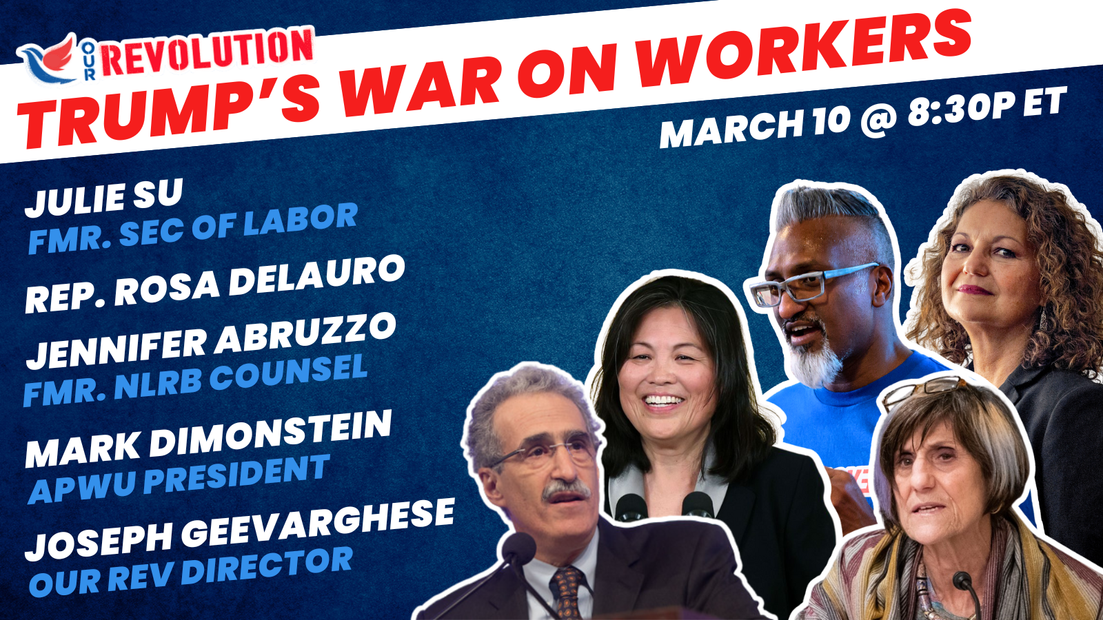 Co-hosted by Our Revolution Executive Director Joseph Geevarghese and Board Chair and Jobs With Justice co-founder Larry Cohen, the virtual event kicks off at 8:30pm ET / 5:30 PT March 10th — don’t miss it!
