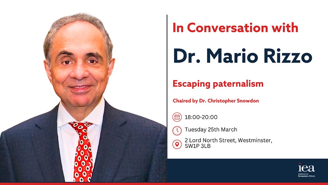 [INVITATION] IEA In Conversation with Mario RizzoEscaping Paternalism: Rationality, Behavioral Economics and Public PolicyThe IEA will be hosting an upcoming event with Mario Rizzo on his book, “Escaping Paternalism”. This event will take place on Tuesday 25th March from 18:00 – 20:00 at the IEA Westminster offices. Chris Snowdon (IEA’s Head of Lifestyle Economics) will chair this event. Mario Rizzo is a professor of Economics, Director of the Foundations of the Market Economy Program, and Co-Director of the Classical Liberal Institute of New York University. He is the co-author of Austrian Economics Re-Examined: The Economics of Time and Ignorance (2014). He has published in such journals as Journal of Legal Studies, the Columbia Law Review and the UCLA Law Review. Please note that places for this event will be operating on a first-come first-serve basis. Date: Tuesday 25th March Time: 18:00 - 20:00 Location: 2 Lord North Street, SW1P 3LB You’re currently a free subscriber to Insider. For the full experience, upgrade your subscription. Paid subscribers support the IEA's charitable mission and receive special invites to exclusive events, including the thought-provoking IEA Book Club. We are offering all new subscribers a special offer. For a limited time only, you will receive 15% off and a complimentary copy of Dr Stephen Davies’ latest book, Apocalypse Next: The Economics of Global Catastrophic Risks. |