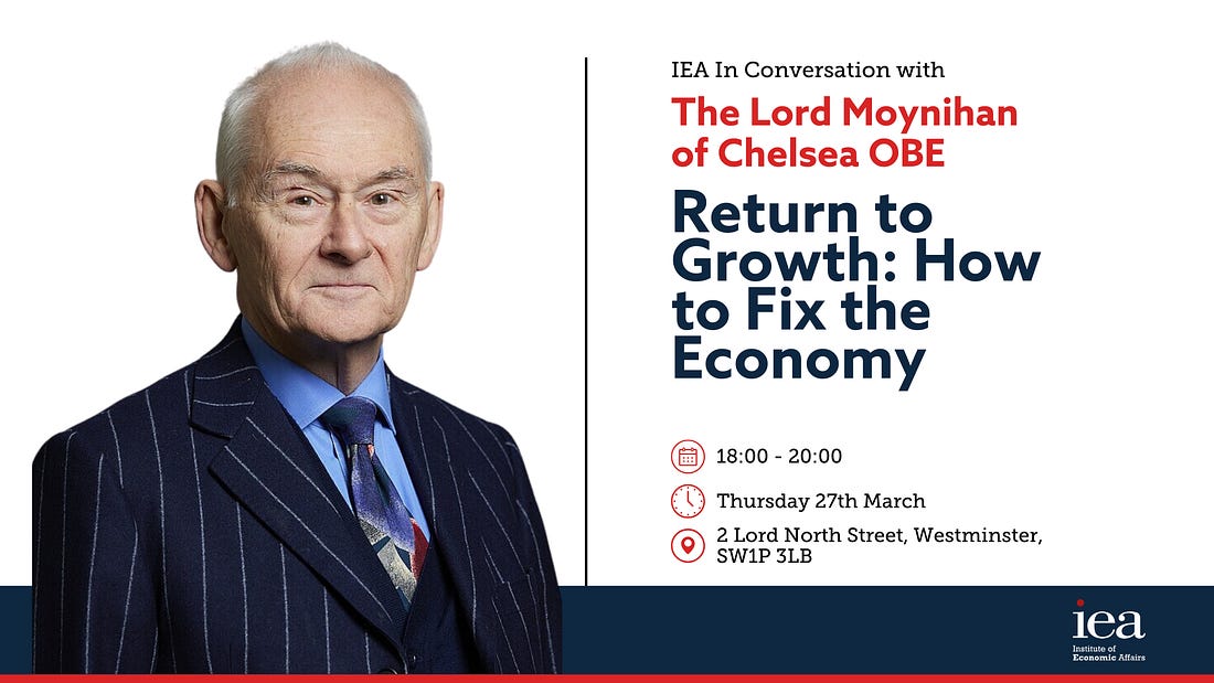 [INVITATION] IEA In Conversation with Lord Moynihan of Chelsea OBEReturn to Growth: How to Fix the EconomyThe IEA will be hosting an upcoming event with Lord Moynihan on his book, “Return to Growth: How to Fix the Economy”. This event will take place on Thursday 27th March from 18:00 – 20:00 at the IEA Westminster offices. Tom Clougherty, the IEA’s Executive Director, will chair this event. The acclaimed Return to Growth Volume One by Lord Moynihan, addressed the mystery of why growth has deserted western democracies like the UK and wrote a tough prescription to cure our economic ills. Continuing his vital examination in Volume Two, Moynihan looks at the excuses of our stagnation, reminding readers of the three ‘devils’ that affect our ability to achieve growth – high government spending, excessive tax and regulation, and too much bureaucratic interference and waste – and finding that the new UK government shows no sign of addressing them. He then isolates and delves into the three crucial ‘angels’ that support economic growth that we urgently need to embrace – free markets, free trade and sound money. In this manifesto for economic change, Moynihan combines his business acuity with a profound political overview, making an authoritative moral case for action, outlining the steps we can take to reverse our decline and avert impending economic disaster. Lord Moynihan is a businessman and venture capitalist who started his career advising companies and banks in the Netherlands, the US and the UK as a specialist in mergers and turnarounds. He then ran the global firm PA Consulting Group for twenty-one years. He subsequently transitioned into venture startups, creating over twenty companies to date, most of them in the science and technology fields. Jon has worked as a volunteer in the charity sector all his life, including in Bangladeshi refugee camps and other developing countries; in educational think tanks, both managing and fundraising for charities; and in the arts sector, where among other activities he was president of the Royal Albert Hall for a number of years. Jon sits in the House of Lords as Baron Moynihan of Chelsea. Date: Thursday 27th March 2025 Time: 18:00 - 20:00 Location: 2 Lord North Street, SW1P 3LB You’re currently a free subscriber to Insider. For the full experience, upgrade your subscription. Paid subscribers support the IEA's charitable mission and receive special invites to exclusive events, including the thought-provoking IEA Book Club. We are offering all new subscribers a special offer. For a limited time only, you will receive 15% off and a complimentary copy of Dr Stephen Davies’ latest book, Apocalypse Next: The Economics of Global Catastrophic Risks. |