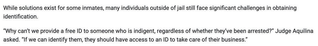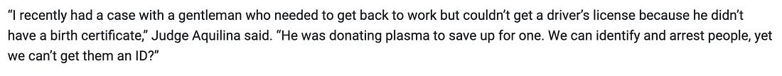 It’s rare for us to find a story about IDs so when this article crossed my desk I jumped up and shouted. For an issue that impacts 26 million American adults, IDs get surprisingly little coverage. But they are critical for millions and millions of Americans to escape poverty and build new lives. No one should have to donate plasma to get an ID. Exactly! I am so thrilled that this incredible judge is standing up for individuals who need IDs to change their lives. I can only hope that more people in the criminal justice system begin to understand and take action to make sure the individuals they encounter have the IDs they need. In the meantime, we’ll keep working. Kat You're currently a free subscriber to IDs for Life. For the full experience, upgrade your subscription. |