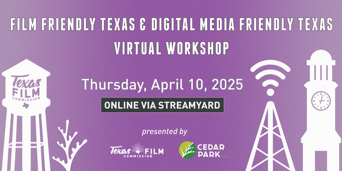 Our next Film Friendly Texas & Digital Media Friendly Texas Virtual Workshop is set to take place on Thursday, April 10, from 9:30AM - 12:30PM on the Texas Film Commission website.