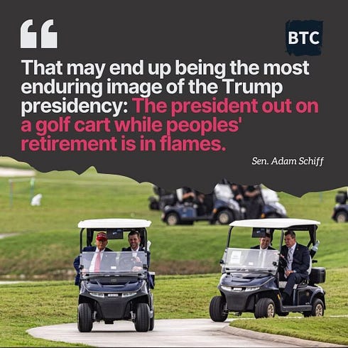 Republicans TURN ON TRUMP As He WRECKS The Stock MarketFather, into your hands, I commend my spirit. Father into your hands...Why have you forsaken me? In your eyes, forsaken me. In your thoughts, forsaken me. In your heart, forsaken me - System Of A DownBLUE LETTERCLIFF’S NOTE: The Tariff Hits The Fan: Trump’s Economic Arson’s So Bad, Even Republicans Are FREAKING OUTThis, my friends, isn’t just another spicy headline crafted to appease the soulless algorithm gods at Meta-gram or MonopoliTube. No—this is as real. The kinda real that smashes stock markets while Grandpa Tariff toodles around in a golf cart—not a care in the world—except kicking his ball outta the rough to cheat like a sweaty, bloated, orange Happy Gilmore. It’s impressively Marie Antoinette, cheating at golf and bankrupting our 401(k)s simultaneously. The problem is—for him, anyhow—MAGA diehards are starting to feel the pain, and it ain’t because they’ve suddenly discovered the joys of Keynesian economics. It’s because his boneheaded tariffs are punching them directly in the gut. And not just regular Republicans, but the elected aristocracy too. Susan Collins isn't “concerned,” anymore, she's screwed. Lumber? Tourism? Gone. Canadians are no longer coming to Old Orchard Beach—they’re too busy not paying 40% more for a crate of American maple syrup. Rand Paul, normally busy auditioning for Russian talk shows, is suddenly screaming at tariffs like they’re his neighbor mowing the lawn. And Mitch McConnell—yeah, I know, he's basically a crumbling animatronic at this point—but when he’s slamming Trump, that’s not out of personal concern. That’s the sound of Corporate America flipping over the Monopoly board and preparing to storm Park Place. Because here’s a dirty little secret I keep harping on, and will until every last person hears it: It doesn’t matter if you’ve got ten bucks or ten million, in terms of how Trump sees you. If you're not part of the Trump-allied oligarchy—the inside crew hoarding cash to buy America on clearance after the crash—you’re nothing. As Gordon Gekko put it in Wall Street: