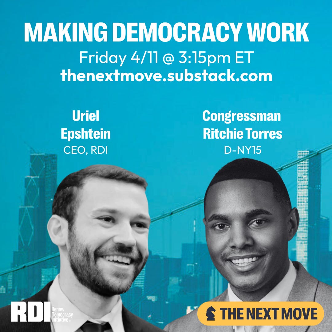 LIVE at 3:15pm TODAY: NY Congressman Ritchie Torres joins the Next MoveCongressman Ritchie Torres joins RDI CEO for a conversation on tariffs, trade, and what to do to make democracy actually function.TODAY at 3:15pm ET, RDI CEO Uriel Epshtein will be joined by Congressman Ritchie Torres (D-NY 15) to discuss tariffs, trade, and what comes next to make democracy actually function for the American people. Use the link below, watch your inbox for an update, or sign on to the Substack app to join in the conversation. |
