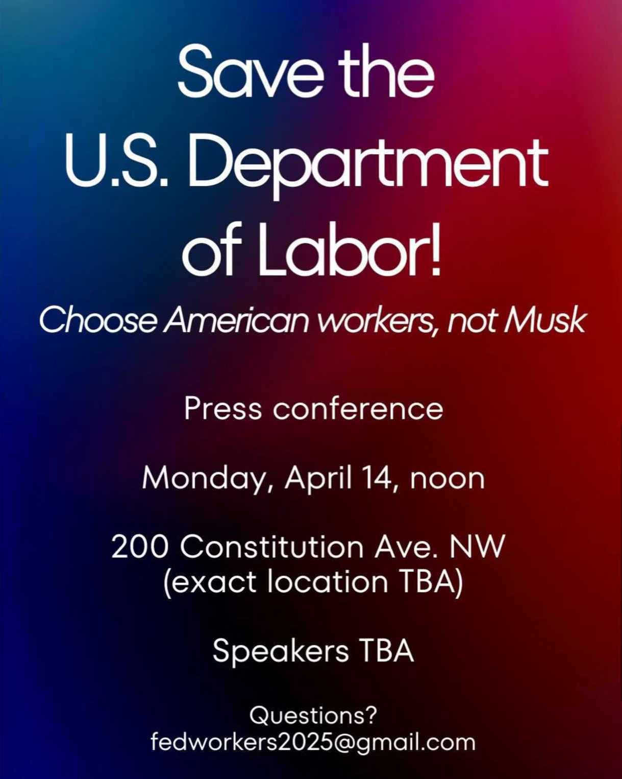 Massive cuts could be coming soon to the U.S. Department of Labor, which would make all workers in the U.S. less safe, less able to organize, and more vulnerable to exploitation. Join DOL stakeholders (union leaders, advocates, former staff, workers) to tell Trump and Secretary Chavez-DeRemer: Choose workers, not Elon Musk!