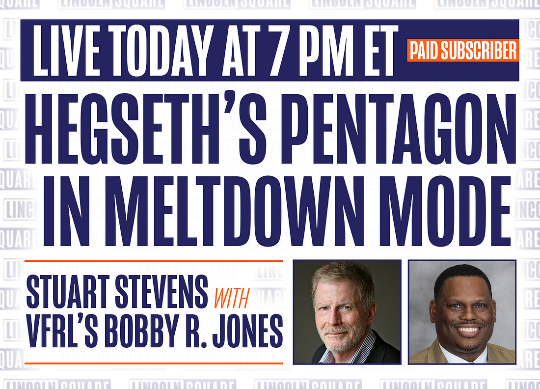 You can financially support our work, please consider becoming a paid subscriber. Join Us LIVE at 7 PM ET - Strategy Session with Stuart Stevens and VFRL President Bobby R. JonesWe're talking Pete Hegseth's Defense-Department-Dumpster-Fire and taking your questions. Not a paid member? Subscribe now to join the live show and chat!You’re currently a free subscriber to Lincoln Square Media. For full access to our content, team, and the community, upgrade your subscription. |
