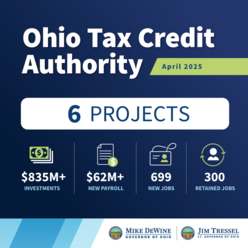 During its monthly meeting, the Ohio Tax Credit Authority reviewed economic development proposals brought to the board by JobsOhio and its regional partners. The projects are expected to result in more than $62 million in new payroll and spur more than $835 million in investments across Ohio.