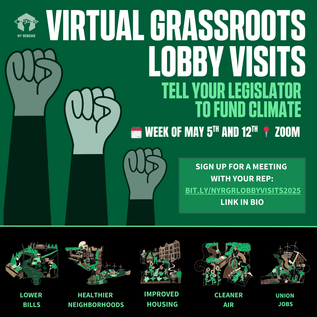 That's not all. If you're fired up to tell your representatives exactly what we need to protect our future, join NY Renews for a virtual grassroots lobby visit. These include NY HEAT, as well as other important pieces of legislation, and are easy to join from anywhere.