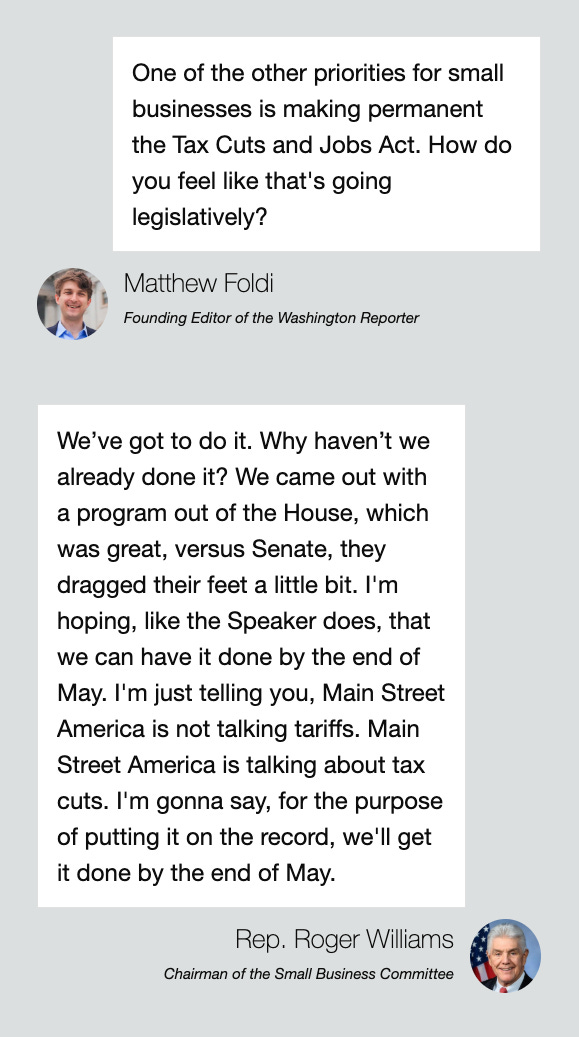 Rep. Roger Williams (R., Texas), the Chairman of the Small Business Committee, has run a small business for almost 60 years. And the Texas Republican has a message for both the mom-and-pop shops and the Dallas Cowboys: “It’s a great time to be in business in America.” Williams said help is on the way. He told the Washington Reporter in an interview that “we'll get [the Trump tax cuts] done by the end of May.” “We’ve got to do it,” Williams said of the Tax Cuts and Jobs Act extension. “Why haven’t we already done it? We came out with a program out of the House, which was great, versus the Senate, they dragged their feet a little bit.” “I'm hoping, like the Speaker does, that we can have it done by the end of May,” he continued. “There's some who say by the Fourth of July, that's fine, get it done. But I'm just telling you, Main Street America is not talking tariffs.” “Main Street America is talking about tax cuts,” he added. Williams explained that Trump’s tax cuts benefit both employers like him and his employees. The former supports the tax cuts because “it cuts payroll taxes.” The latter backs it because “they want more money in their pockets.” Additionally, the bill “allows 100 percent expensing, which is huge, where you buy equipment and write it off the year you buy it.” Main Street America, Williams emphasized, cares far more about tax cuts than tariffs. “Of course, the press wants to talk about tariffs and this and that, but they need to be talking about the opportunities out there,” Williams said. Williams, himself a long-time car dealer, said that his industry hasn’t even seen any tariffs hit yet — but he said that he’s not “afraid” of them regardless. “I'm aware, and the industry is aware, but we're not afraid, because this industry has always had a way to get around and take problems and turn them into opportunities and turn opportunities into development, and you're going to see that in the auto industry right now,” Williams said. HEARD ON THE HILL