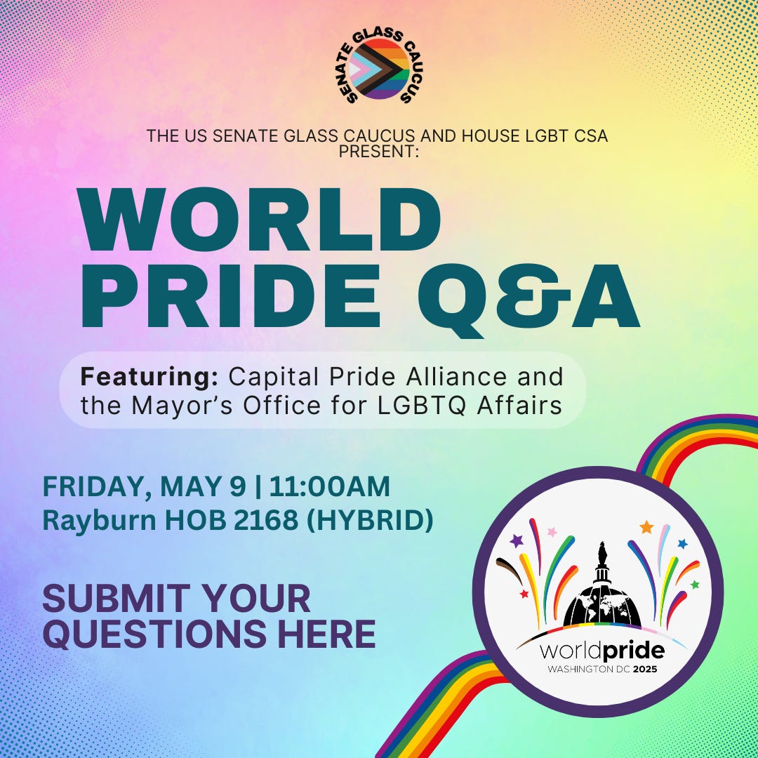 GLASS members are invited to attend the LGBT Congressional Staff Association’s general body meeting to hear directly from officials from the DC Mayor’s Office and Capital Pride Alliance leadership about World Pride preparations. 📅 Date: TODAY, Friday, May 9 👉 RSVP here. |