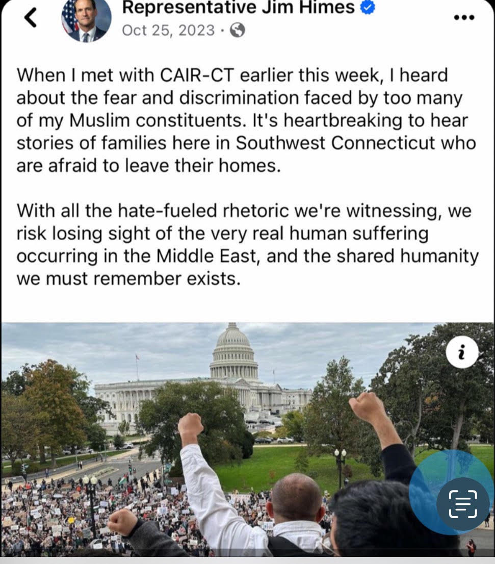 With Anti-Semitism at an all time high – we should eliminate the Hitler analogies…. Jim doesn’t and continues to sting like a bee. Last month’s article exemplifies Himes’ misinformation to project his beliefs while instilling fear to secure his progressive base with their hatred for President Trump. In Progressive terms, Himes has conscious and unconscious bias towards Marxism; he was so enthralled with the Marxist dictator of Nicaragua, Daniel Ortega that he spent 2 months in Nicaragua while at Harvard. This resulted in his almost 100 page essay that glorified this Marxist dictator who ran that government like a King. Himes instills fear by falsely alleging that President Trump wants to be a king. Over the past 100 plus days of his administration, Trump’s actions demonstrate his desire to represent the American public that supported him at the polls by draining the swamp, and by calling out and dismantling the totalitarian policies supported by Himes and his progressive left colleagues. These gems include AOC, Bernie Sanders, and Connecticut’s Chris Murphy and Rosa DeLauro and so many others. Himes also talks about how "Our politics have become ugly really ugly. I mean politics have always been tough, but you know more Americans than ever before -- some 40% -- think that violence is okay in certain circumstances.” He makes that soundbite and ignores the reality that his supporters and the Indivisible and Hands-Off movements throughout this country are really behind the destruction and violence – it wasn’t conservatives destroying Teslas and it wasn’t conservatives looting and pillaging stores and setting cities on fire during the “summer of love” – They are Jim’s base. Conservatives aren’t taking over college campuses and wearing Kufiyahs spouting antisemitic remarks - It is the progressives acting like the Nazis by blocking Jewish students from learning. The Anti Defamation League put out a report and “In 2024, ADL recorded 1,694 antisemitic incidents on college campuses, which is 84% higher than in 2023. Campus incidents comprised 18% of all incidents, a larger proportion than in any previous Audit.” See Report With regard to the violent antisemitism that is taking place on college campuses, especially at Himes alma mater Harvard, Himes congratulates Harvard for resisting the Federal Government’s retaliation against the hate crime of antisemitism. This is the worst case of university tolerated antisemitism since the 1930’s antisemitic riots against Jews in Hitler’s Nazi Germany. It is expected to increase given the riots at Columbia this week and destruction of the university in the name of Free Palestine by protestors. Himes’ endorsement of hate mongers will result in additional physical violence against Jewish Harvard students by calling these students courageous for telling Trump to go pound sand as this is true resistance. Sorry – this is hate mongering so entrenched that they are not willing to change. As for general antisemitism, the ADL found that “In 2024, ADL tabulated 9,354 antisemitic incidents across the United States. This represents a 5% increase from the 8,873 incidents recorded in 2023, a 344% increase over the past five years and a 893% increase over the past 10 years. It is the highest number on record since ADL began tracking antisemitic incidents 46 years ago. We the public, should not be funding institutions that promote antisemitism and hate against jews, the canary in the coal mine. As demonstrated in Nazi Germany, once they get finished with hating Jews, they'll go on to hate somebody else – hate is a parasite that always finds a new host. Qatar is responsible for $6.3 billion in support for US universities buying influence. Himes enthusiastic support of these Islamo-Fascists is misguided; it demonstrates once again Congressman’s true deep-seated ideologies and the hope for a Marxist regime here in the US. In response to this regime change in Himes’ utopian Nicaragua, 20% left and 7% of the Nicaraguan population now lives in the United States. On a relative basis that would be the equivalent of an exodus of 70 million people from the US. To put that in perspective, Kamala Harris received 75 million votes so this would amount to 93 percent of those that voted democrat in November. Such an exodus would never happen in a government that was well liked and popular among the people. Himes’ affinity for such a regime is a major warning sign. This is not the first time Himes and his progressive team get it wrong Himes and his progressive left buddies have been wrong for a while with the greatest blunder on the silence on Biden’s open border policy that resulted in 20 million illegal aliens that came here to take and destroy the fabric of our democracy, rather than contribute and be self-sufficient. The result was criminals, gang members and terrorists. Himes and his cohort refused to sign a bill to deport illegal aliens that were convicted of sexually assaulting women and experienced due process. Himes also believes that transgender males should be engaged in boxing matches and other contact sports with biological females. In the Middle East, Himes plays both sides. He is somewhat supportive of Israel, preventing Iran from nuclear weapons, but at the same time, he panders to an entity known as CAIR. It is one thing to support religious freedom and Islam; it’s another to support CAIR by name and its leaders that praised the Hamas murderers on October 7th. Jim’s X Post right after October 7th Other Blunders Himes ran cover while Biden's senility was affecting how our country was run without an active president. When the money pipeline shut down and it was impacting his re-election chances, Jim did a quick 180 and was one of the first to turned on Biden. Despite an office in Bridgeport, Himes has abandoned the poor Democrat cities with the worst school rankings. He refuses to allow school choice. The result is