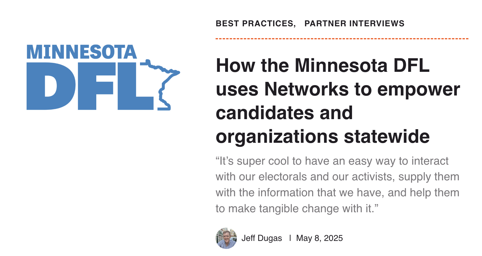 Our latest blog post delves into how the Minnesota DFL uses Networks to empower candidates and organizations statewide. Tyler Schultz, Data Director at the DFL, offered this bit of advice for using Networks effectively: