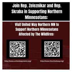 We are grateful for all of the fire departments around the state that are sending firefighters and equipment to help! We are also grateful to Gov. Walz for calling in the National Guard and for all of the Guard members who are up there battling these fires to save homes, communities and our beautiful forests. You can see my remarks on the wildfires here. If you would like to donate to help the affected communities, Rep. Zeleznikar and Rep. Skraba recommend you use the reputable sites using the QR codes above.