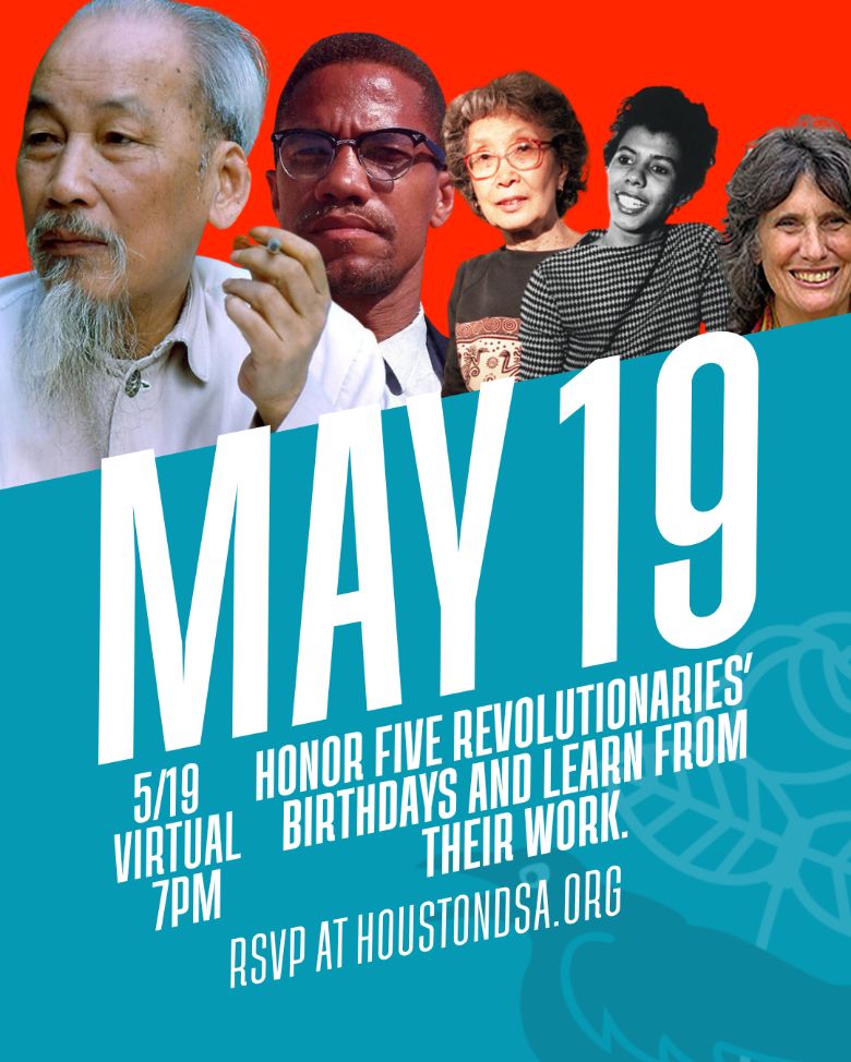 May marks many anniversaries of socialist struggle and victories. May 19th is the birthday of five revolutionaries: Ho Chi Minh, Malcom X, Yuri Kochiyama, Lorraine Hansberry, and Kathy Boudin. Join us via Zoom to honor their birthdays by learning from their work.
